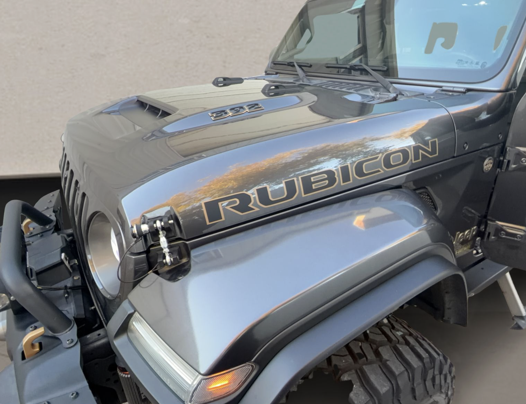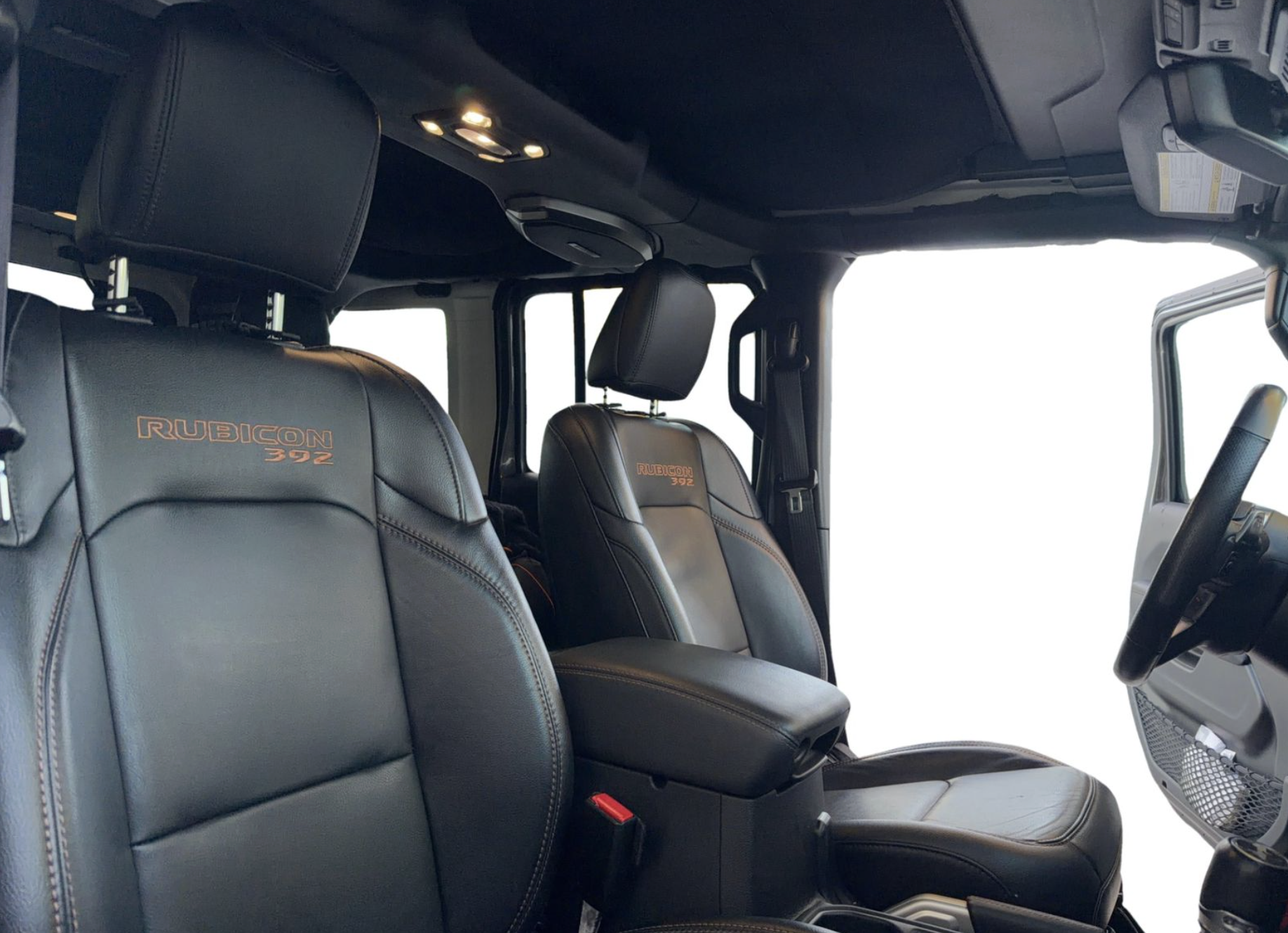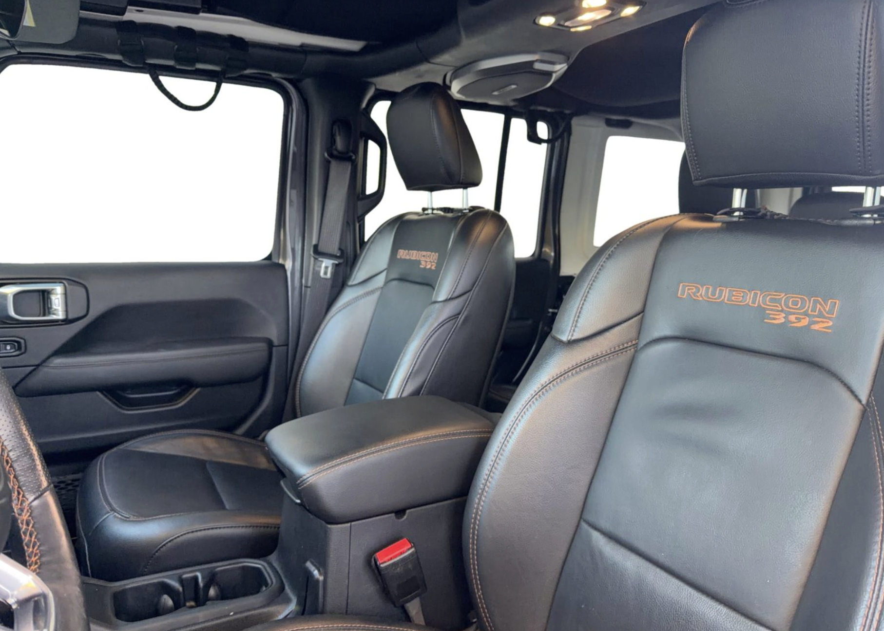 The exterior styling reflects the Rubicon 392’s bold intentions, featuring the signature Wrangler silhouette with a performance twist. The gray finish pairs perfectly with aggressive fender flares, a sport‑inspired hood with heat extractors, and a front grille that hints at the raw power beneath. Heavy-duty equipment, such as stout bumpers, recovery hooks, and oversized all-terrain tires, bolsters its capability, while removable doors and roof panels ensure an immersive open-air experience when adventure calls. The Rubicon 392’s presence is unmistakable — rugged yet refined, ready for trail challenges or everyday driving alike.