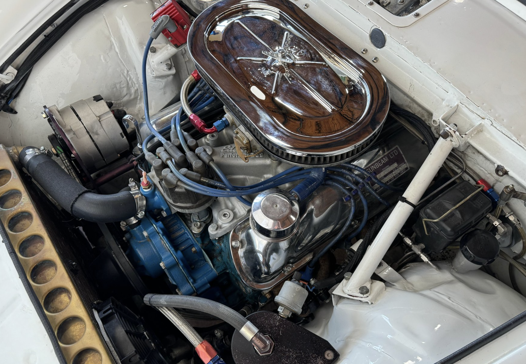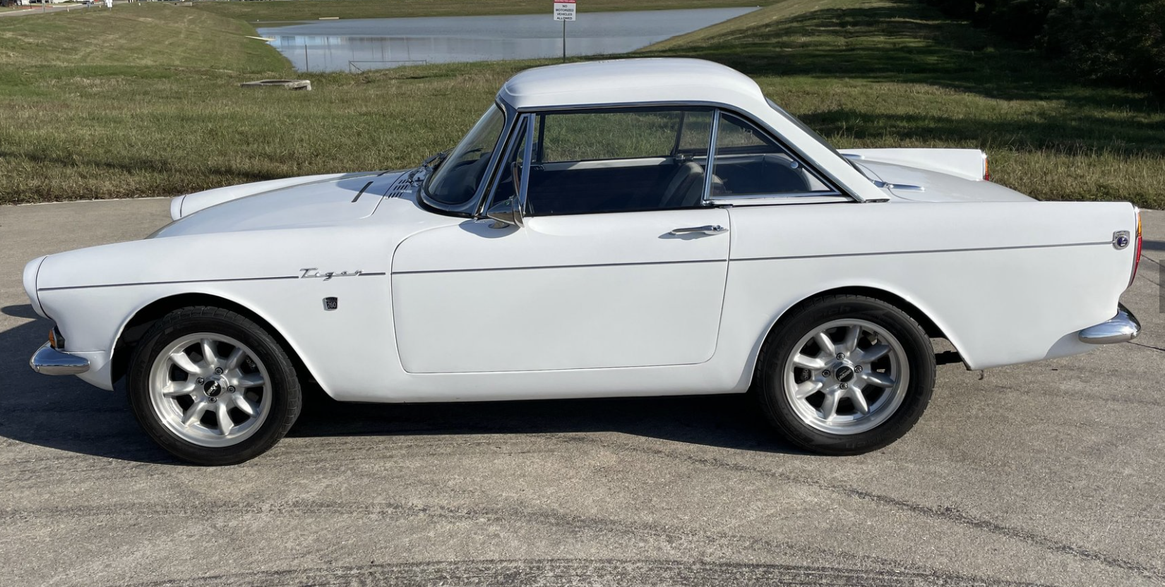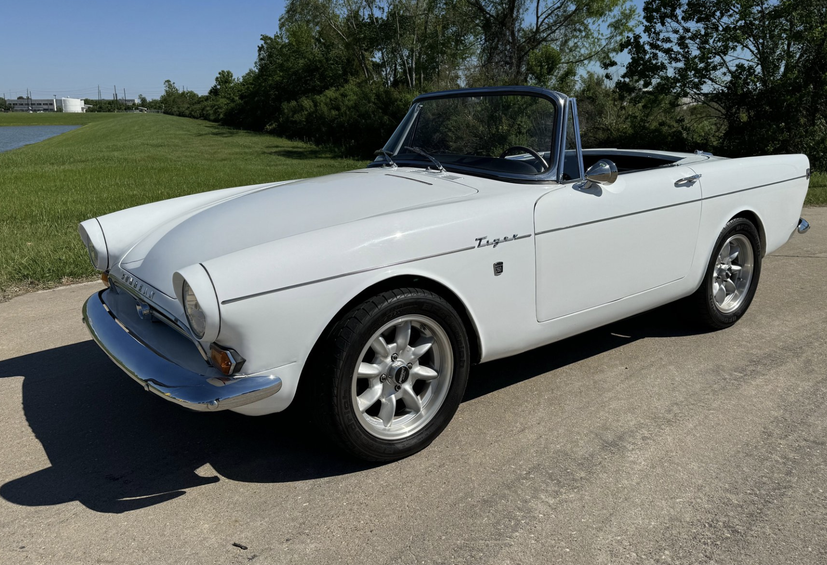The White exterior of this 1965 Sunbeam Tiger radiates classic 1960s sports-car allure, with its graceful roadster silhouette, sculpted fenders, and compact proportions that hint at the power underneath. The body showcases the proper Tiger-specific cues, including correct badging, brightwork, and trim elements. Chrome bumpers, polished details, and the distinctive front fascia highlight the car’s period-correct character. Sitting on period-appropriate wheels wrapped in performance-oriented tires, the Tiger maintains an elegant yet aggressive stance that perfectly complements its driving personality. The finish and exterior presentation highlight the timeless styling that has made the Tiger a sought-after collector favorite.