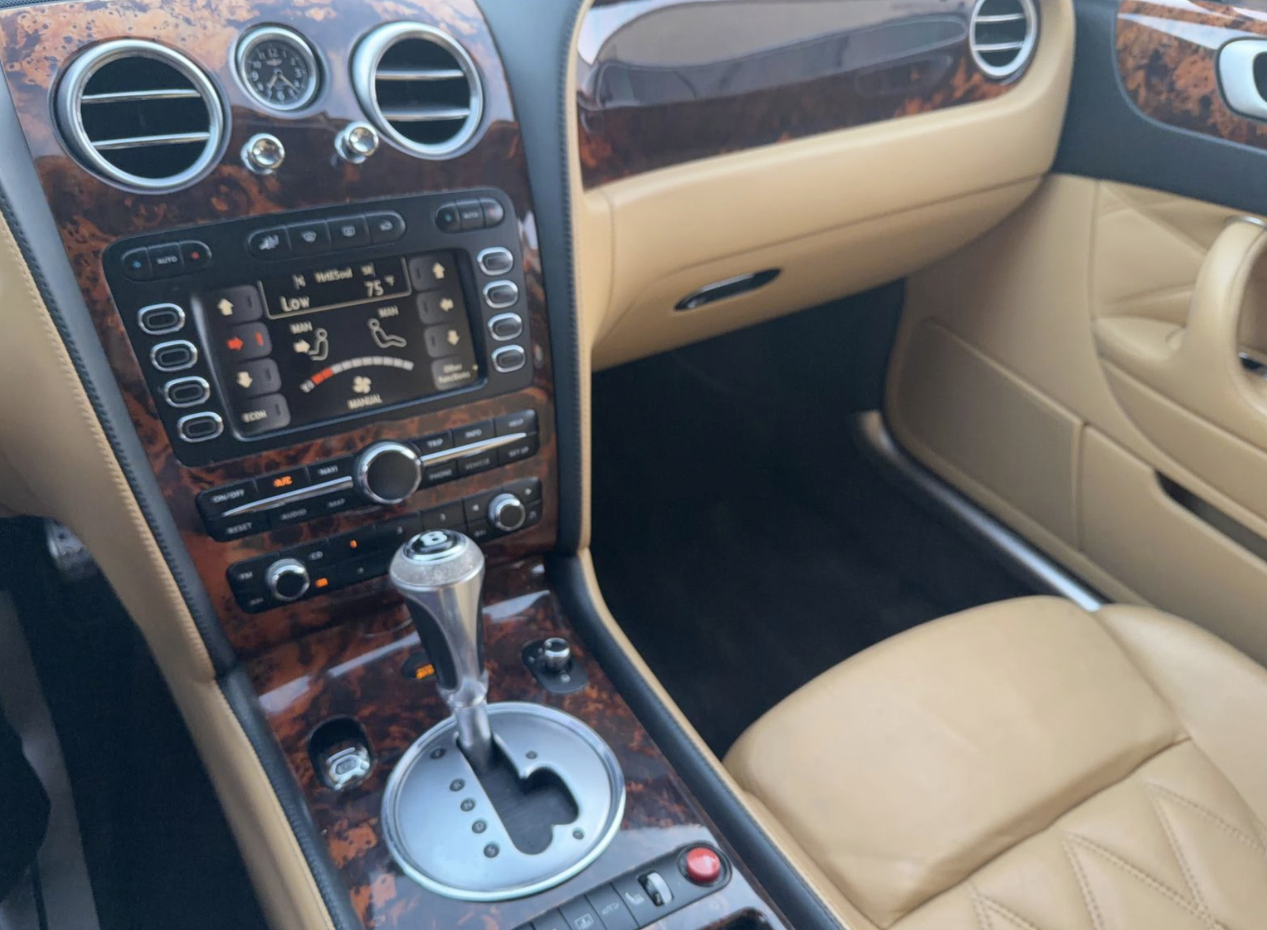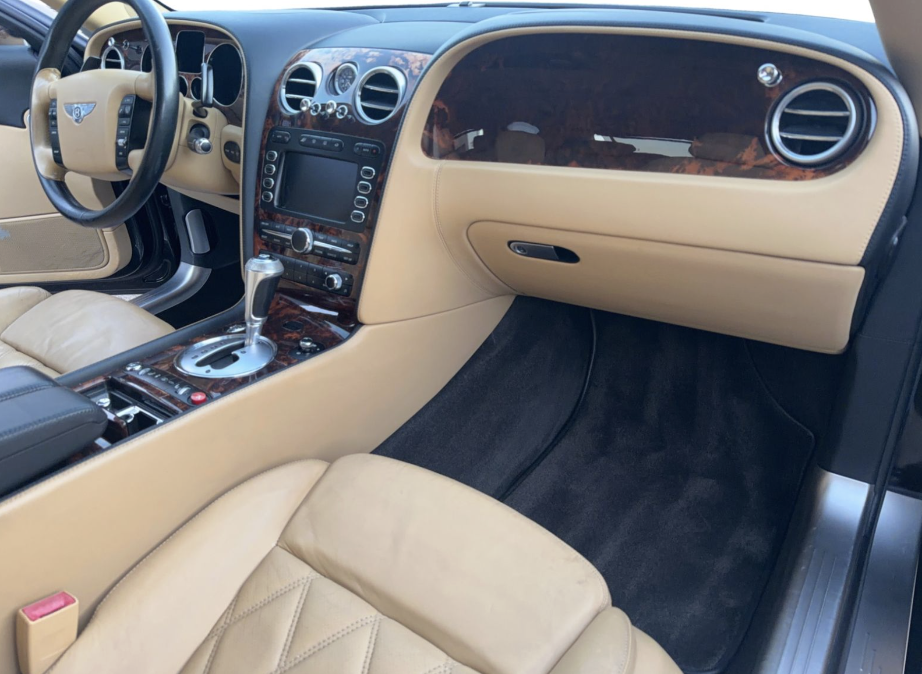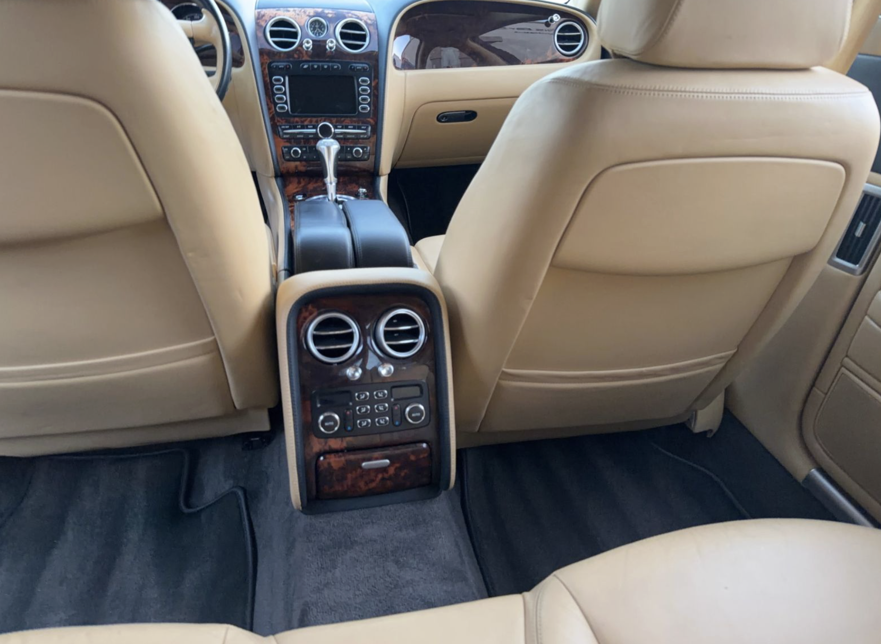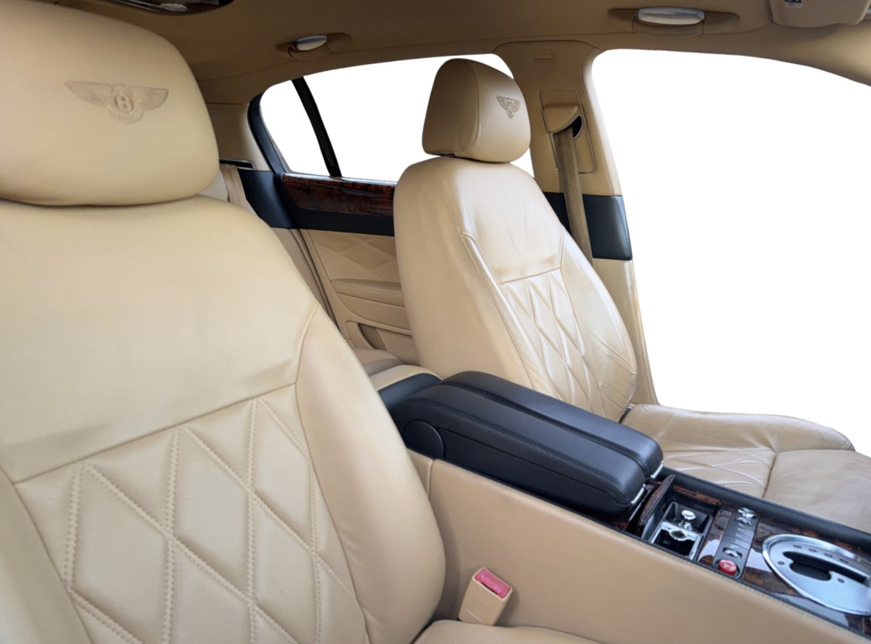 Inside, the Tan interior welcomes occupants with an atmosphere of luxury and comfort. Rich leather seating and handcrafted details reflect Bentley’s renowned commitment to artisanal quality. The spacious cabin offers generous legroom and premium appointments, including dual‑zone automatic climate control, premium sound system, wood and metal trim accents, and intuitive controls that elevate both driver and passenger comfort on every journey.