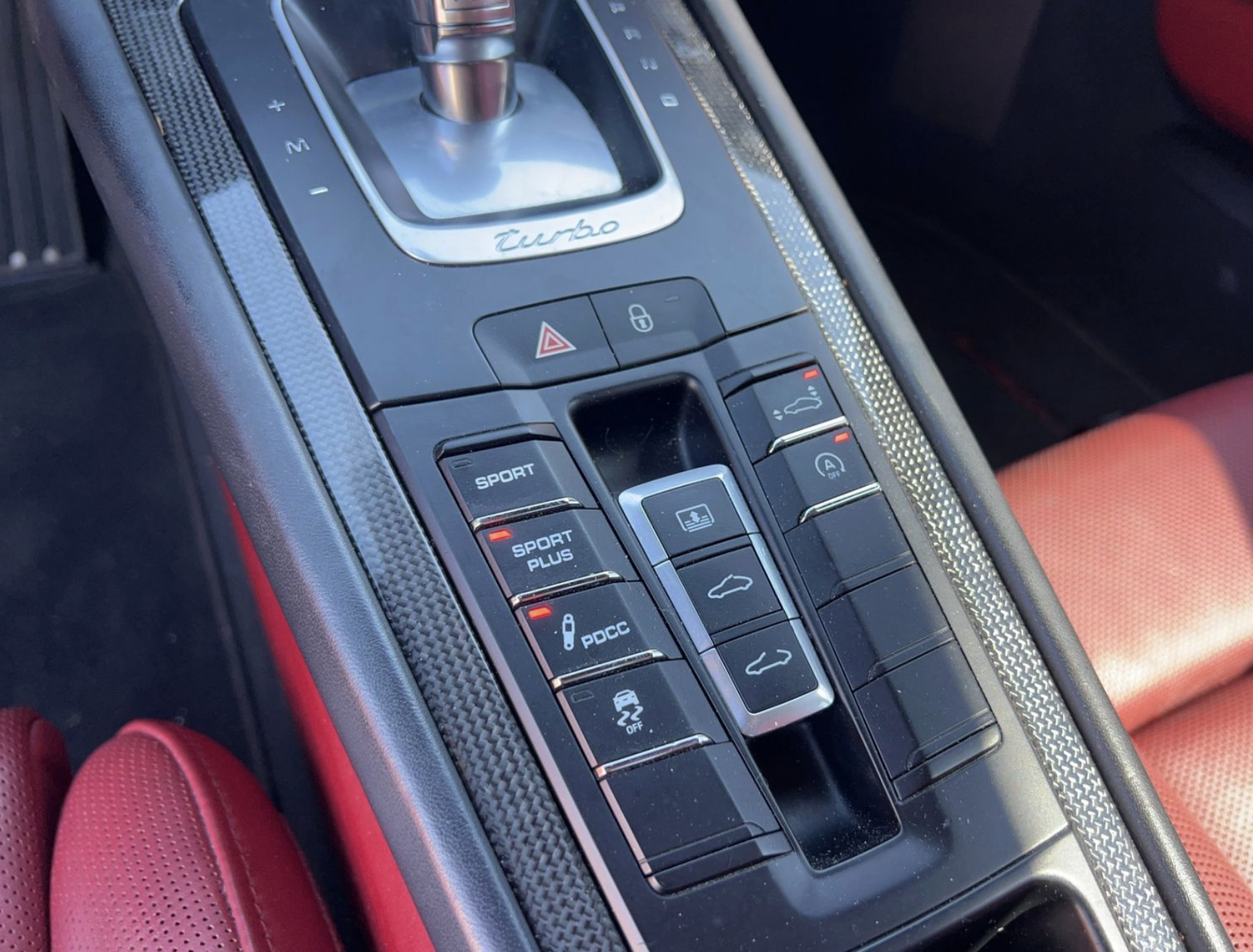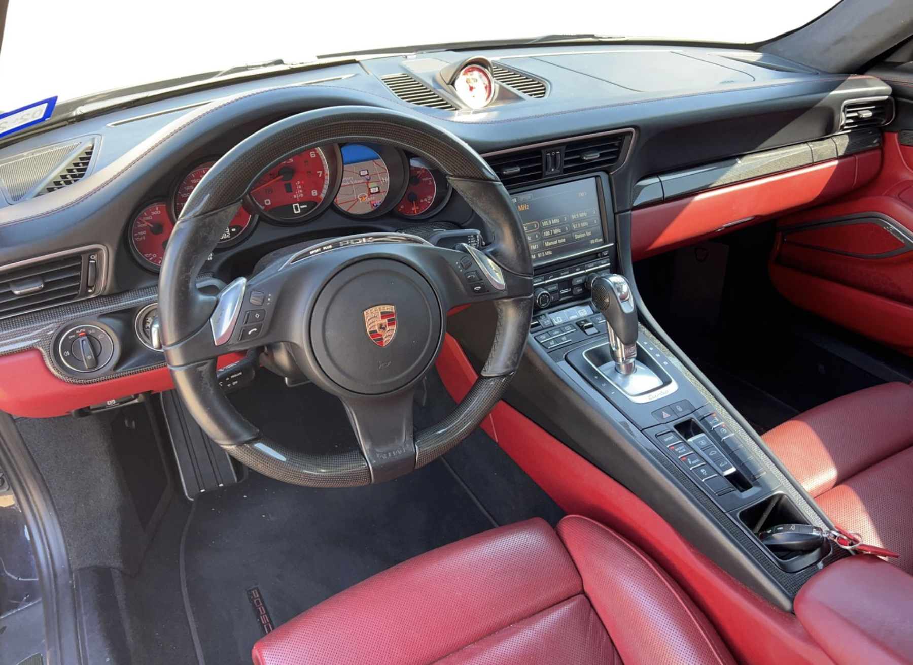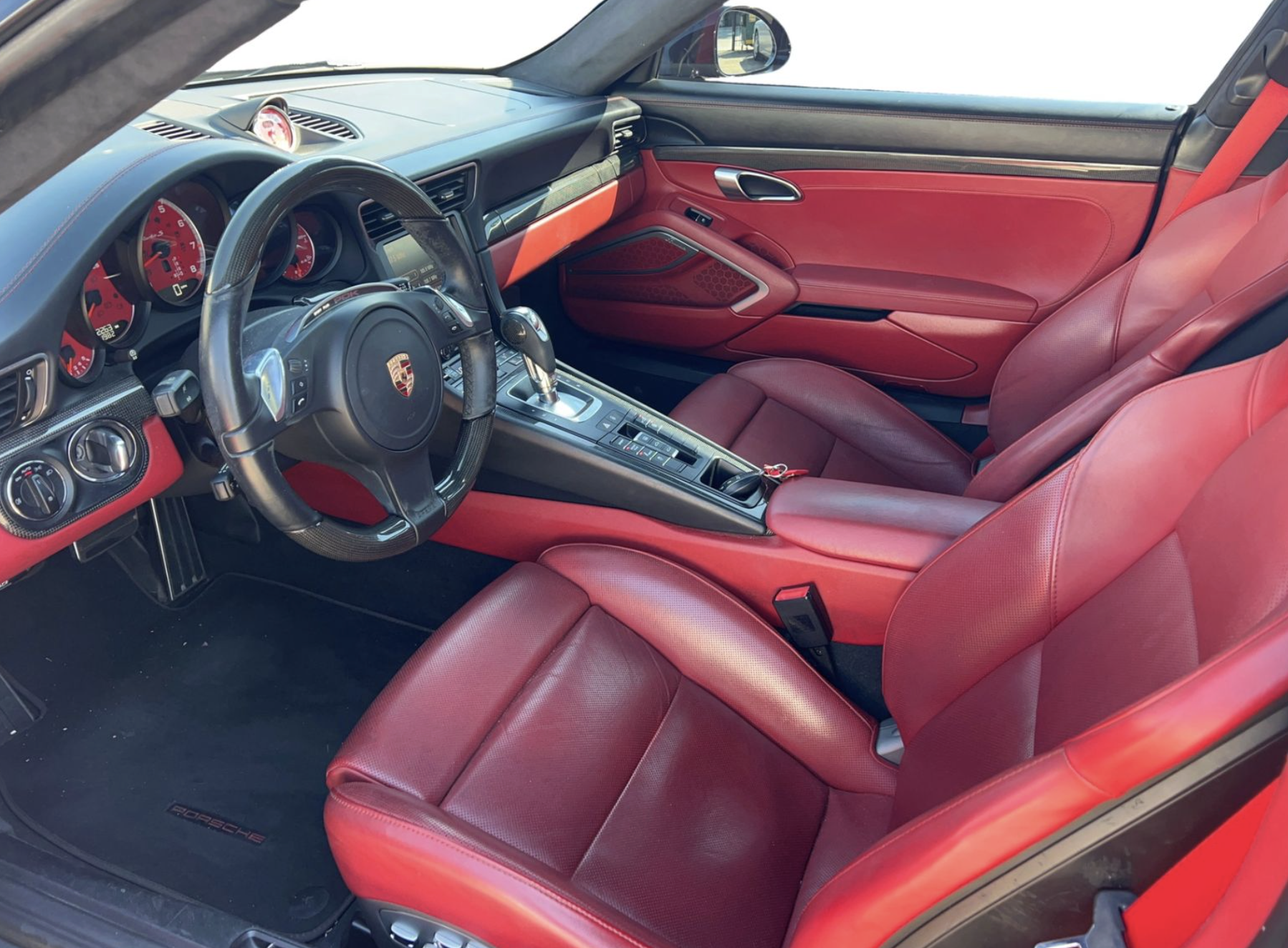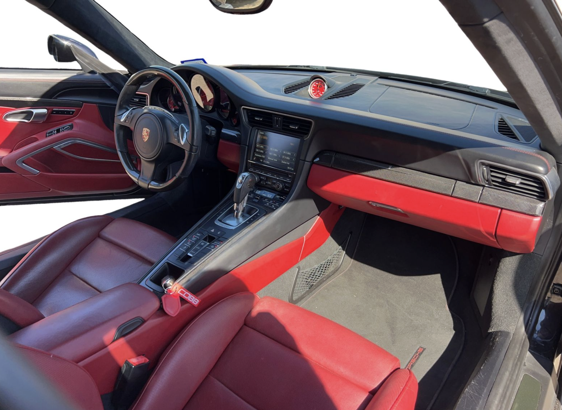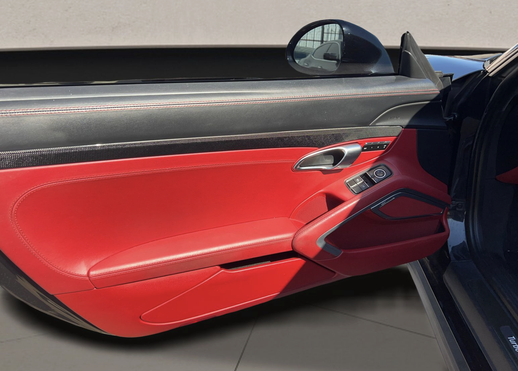 The cabin is trimmed in Red leather, creating a bold and sporty contrast with the exterior. Featuring a driver‑focused layout, this Turbo S includes premium sport seats, a multifunction steering wheel, dual‑zone automatic climate control, Porsche Communication Management with navigation, and high‑end materials throughout for comfort and control on any drive.