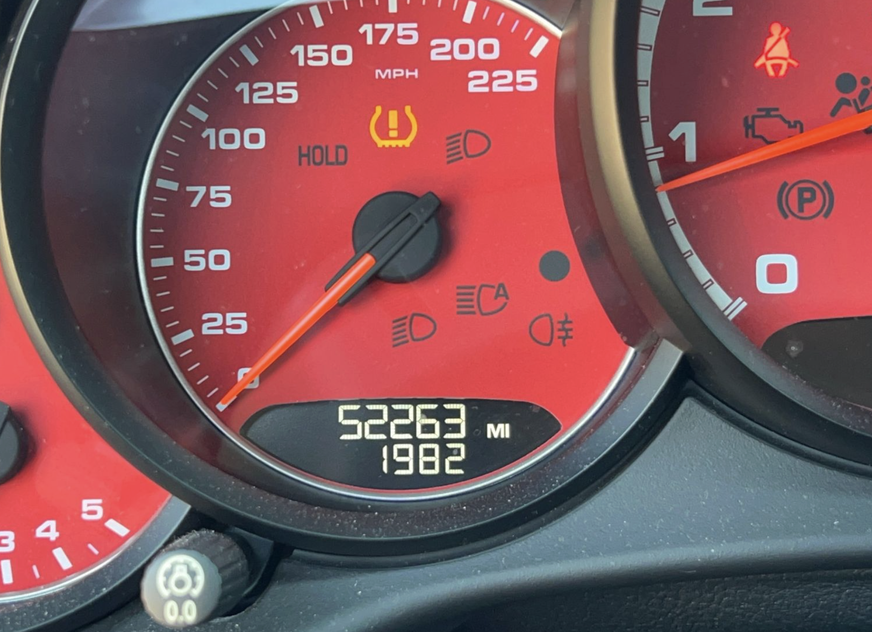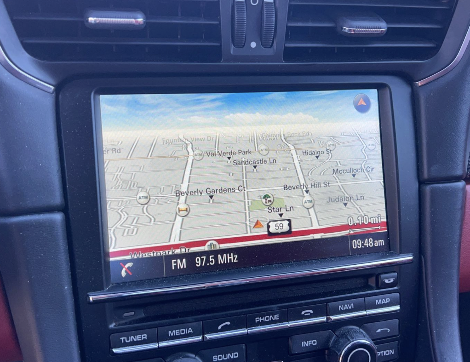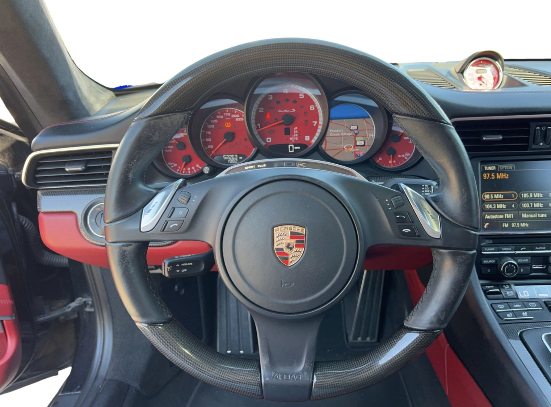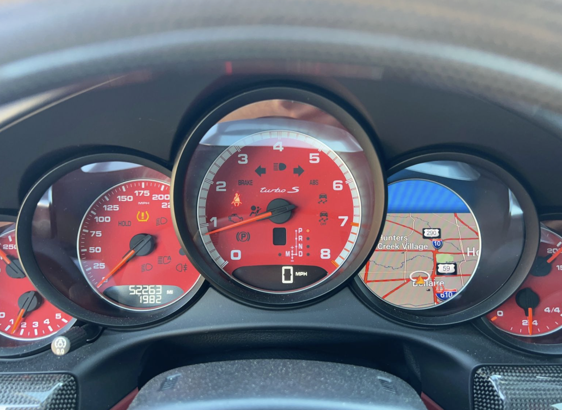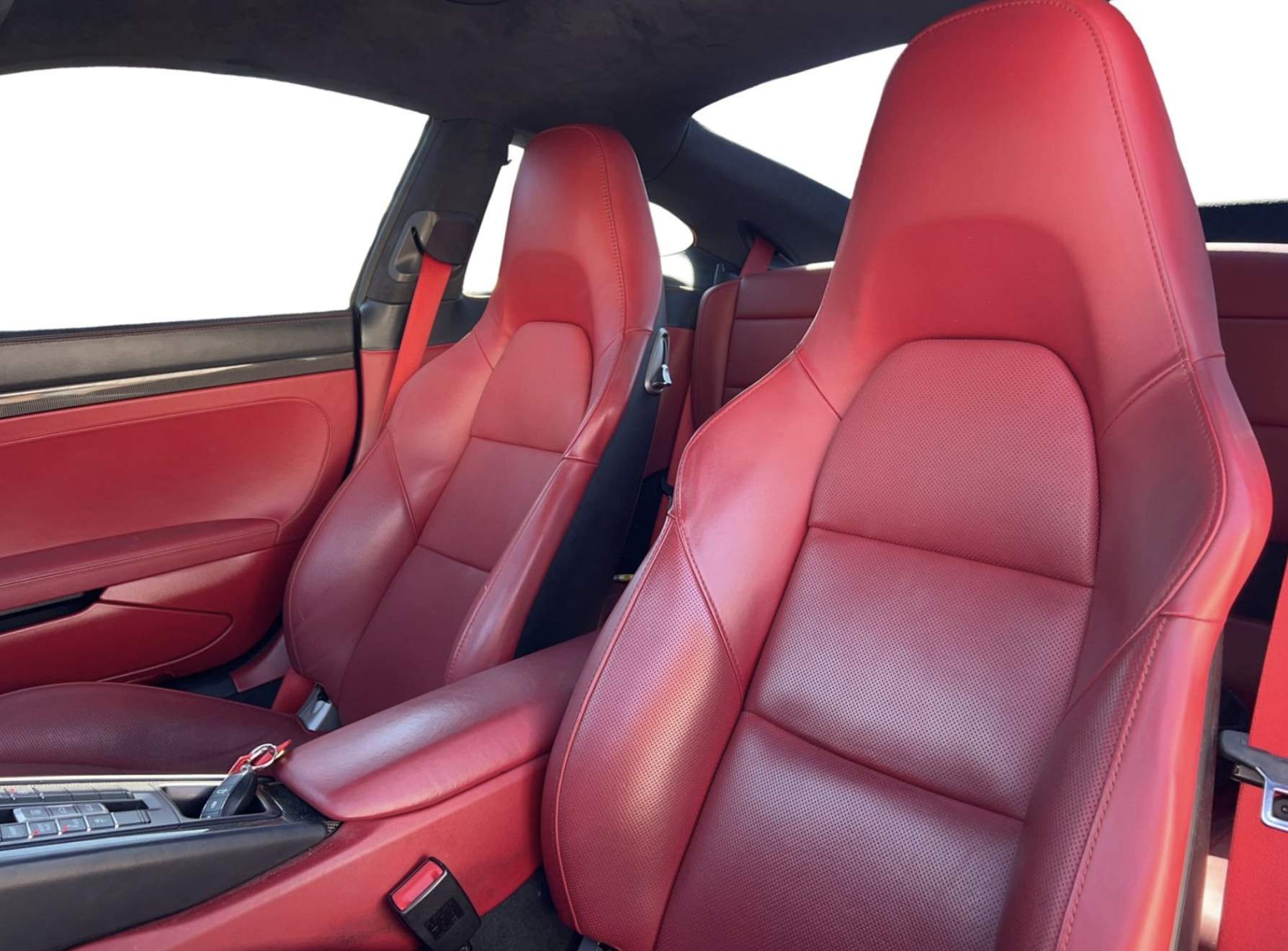 The cabin is trimmed in Red leather, creating a bold and sporty contrast with the exterior. Featuring a driver‑focused layout, this Turbo S includes premium sport seats, a multifunction steering wheel, dual‑zone automatic climate control, Porsche Communication Management with navigation, and high‑end materials throughout for comfort and control on any drive.