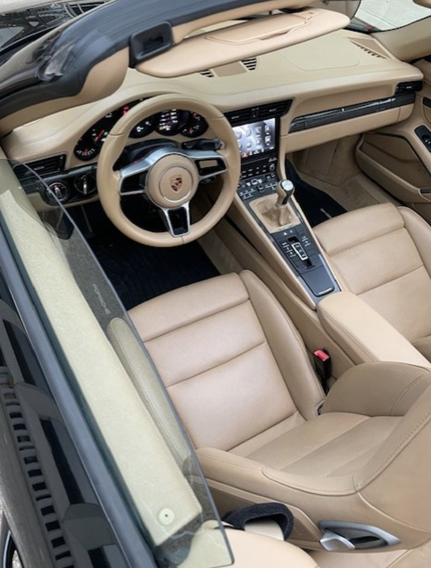 Step inside, and you’re met with a clean, well-appointed Tan leather interior that brightens the cabin and offers a warm contrast to the exterior. Porsche’s famously ergonomic layout is on full display; every control falls easily to hand, and the cabin surrounds the driver in a space that feels focused but not austere.The manual shift lever sits proudly at the center, reminding you this is a machine built for people who still want to drive. The seats are supportive and comfortable for long distances or canyon carving, and the rear seats give you some daily versatility or extra room for a weekend getaway. Features include Heated and ventilated front seats, Porsche Communication Management (PCM) with navigation, Bose® premium surround sound, Dual-zone automatic climate control, Power soft-top with glass rear window, and Keyless entry with a push-button start