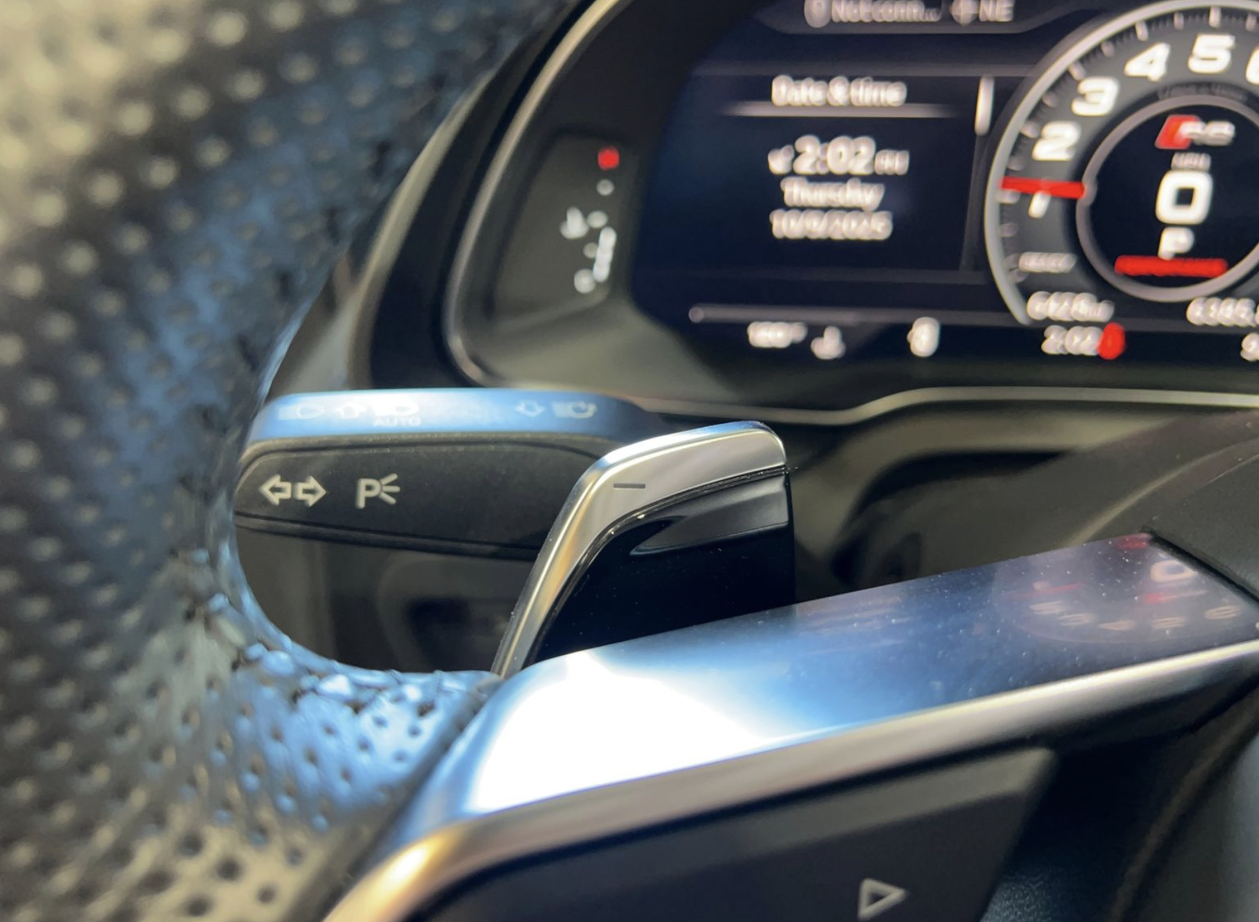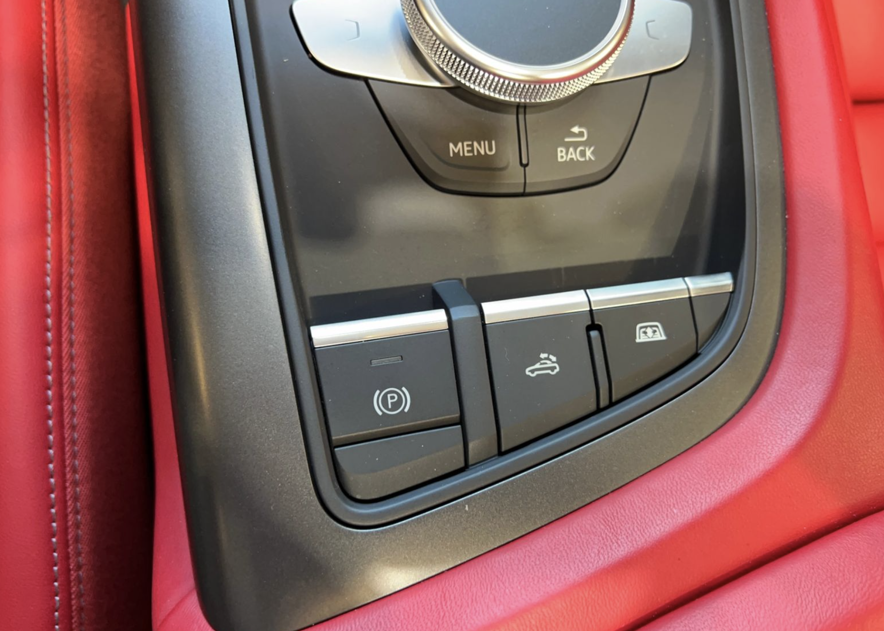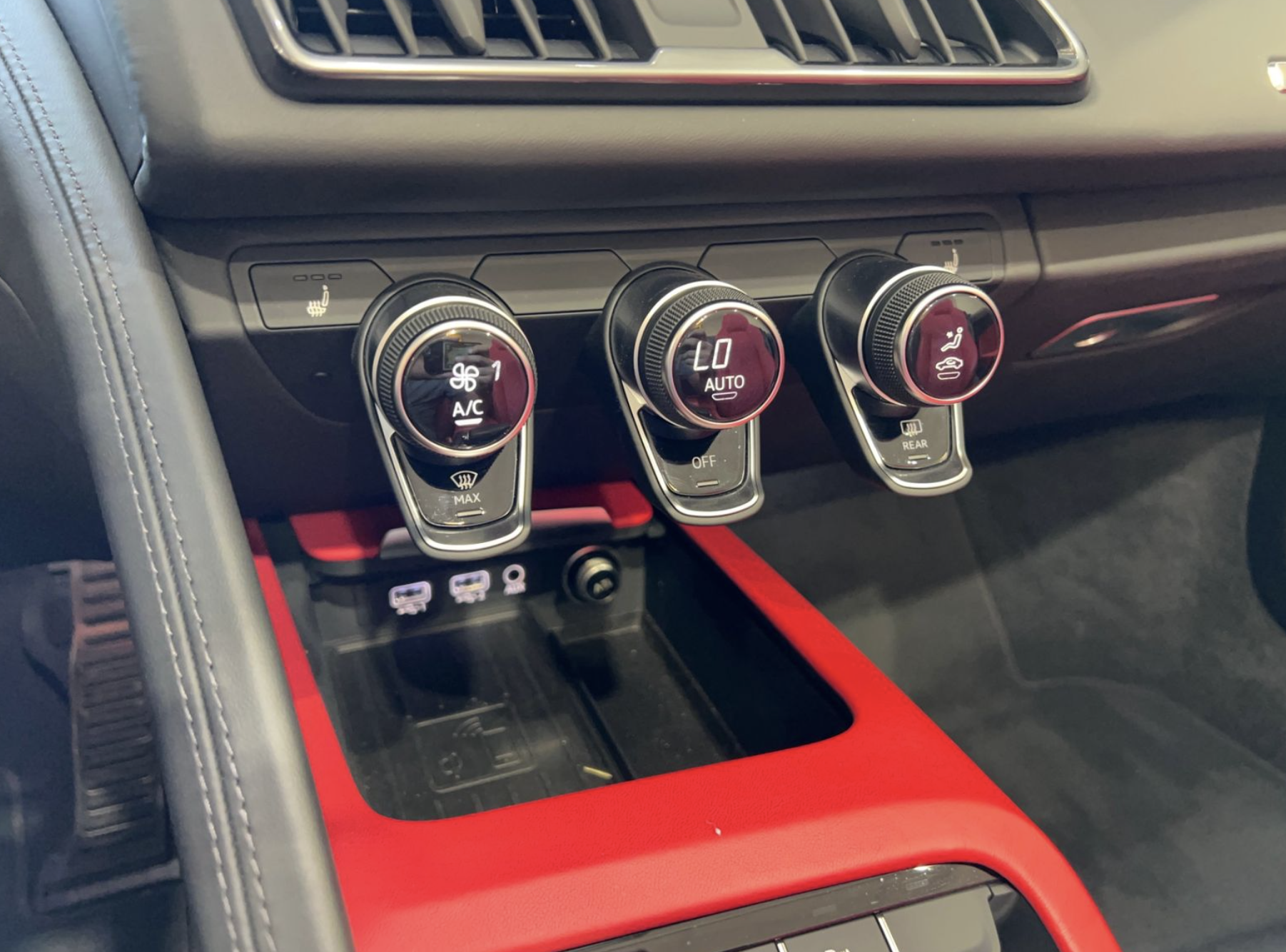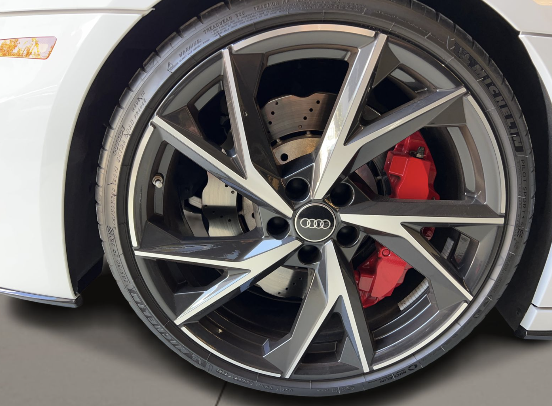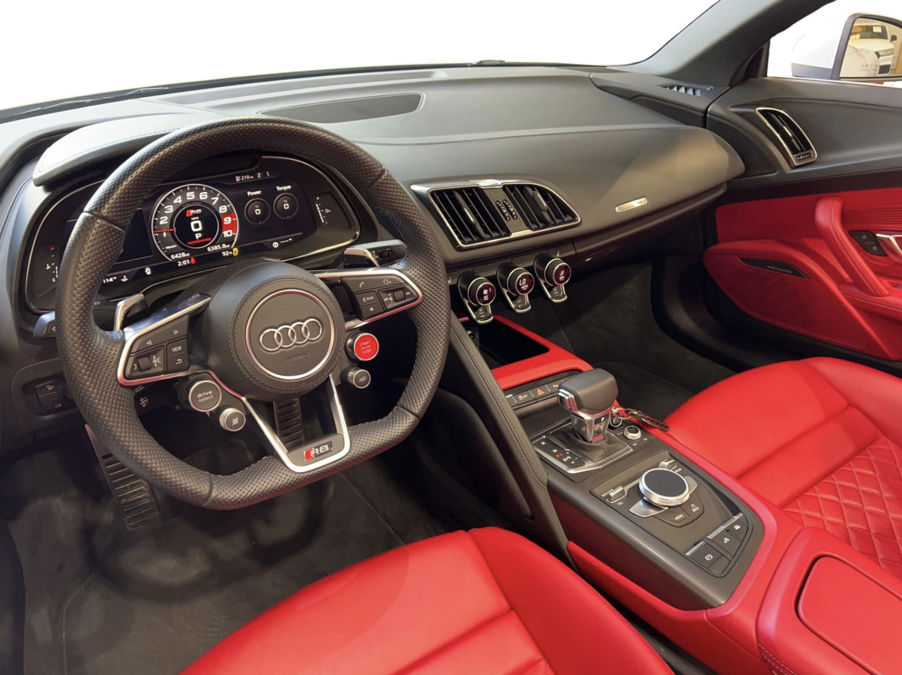 Inside, the cabin is upholstered in premium red leather, creating a dramatic contrast with the exterior. Power-adjustable sport bucket seats provide both comfort and support, while the driver-focused cockpit features Audi’s Virtual Cockpit digital display, multifunction steering wheel, automatic climate control, push-button start, and modern infotainment controls. Aluminum trim accents and high-quality materials throughout highlight Audi’s attention to detail, offering a luxurious yet performance-oriented interior experience.