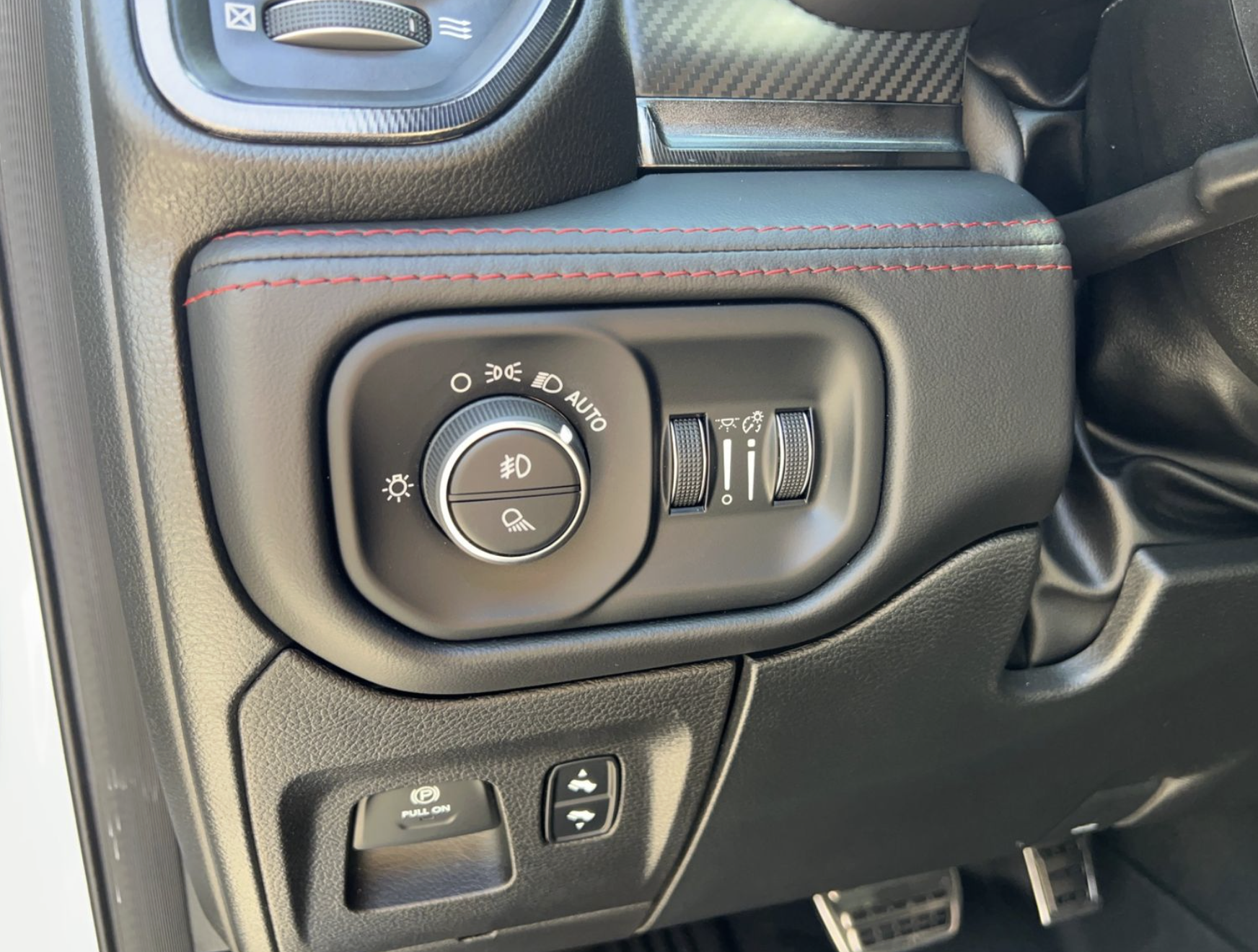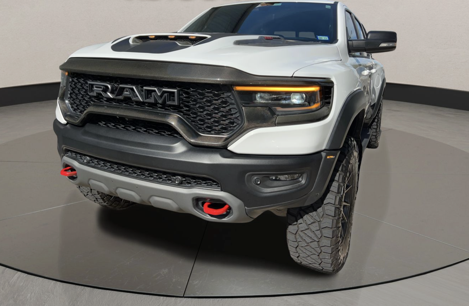 This bold truck wears a striking White exterior accented by aggressive styling cues that set the TRX apart. Exterior features include a performance hood with functional air inlets, widebody fender flares, LED headlights and fog lights, rear LED taillights, tow hooks, rugged off-road tires wrapped on performance wheels, and dual exhaust outlets that announce its presence.
