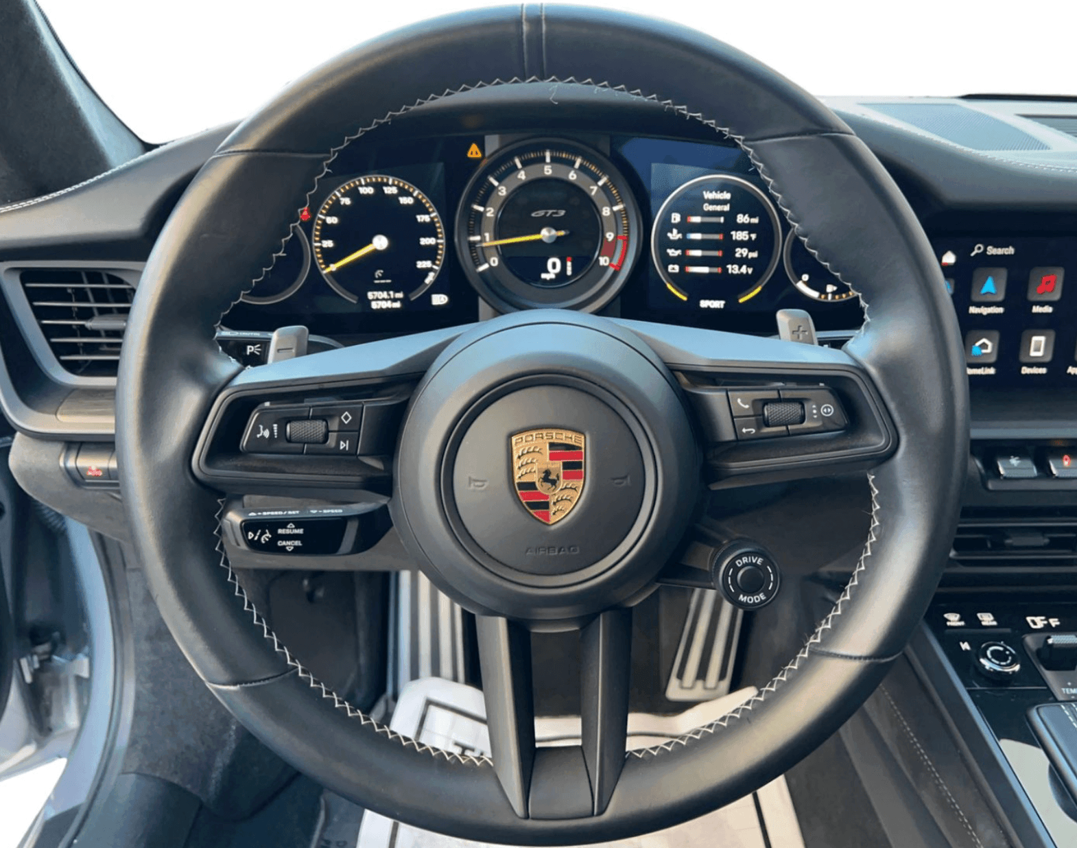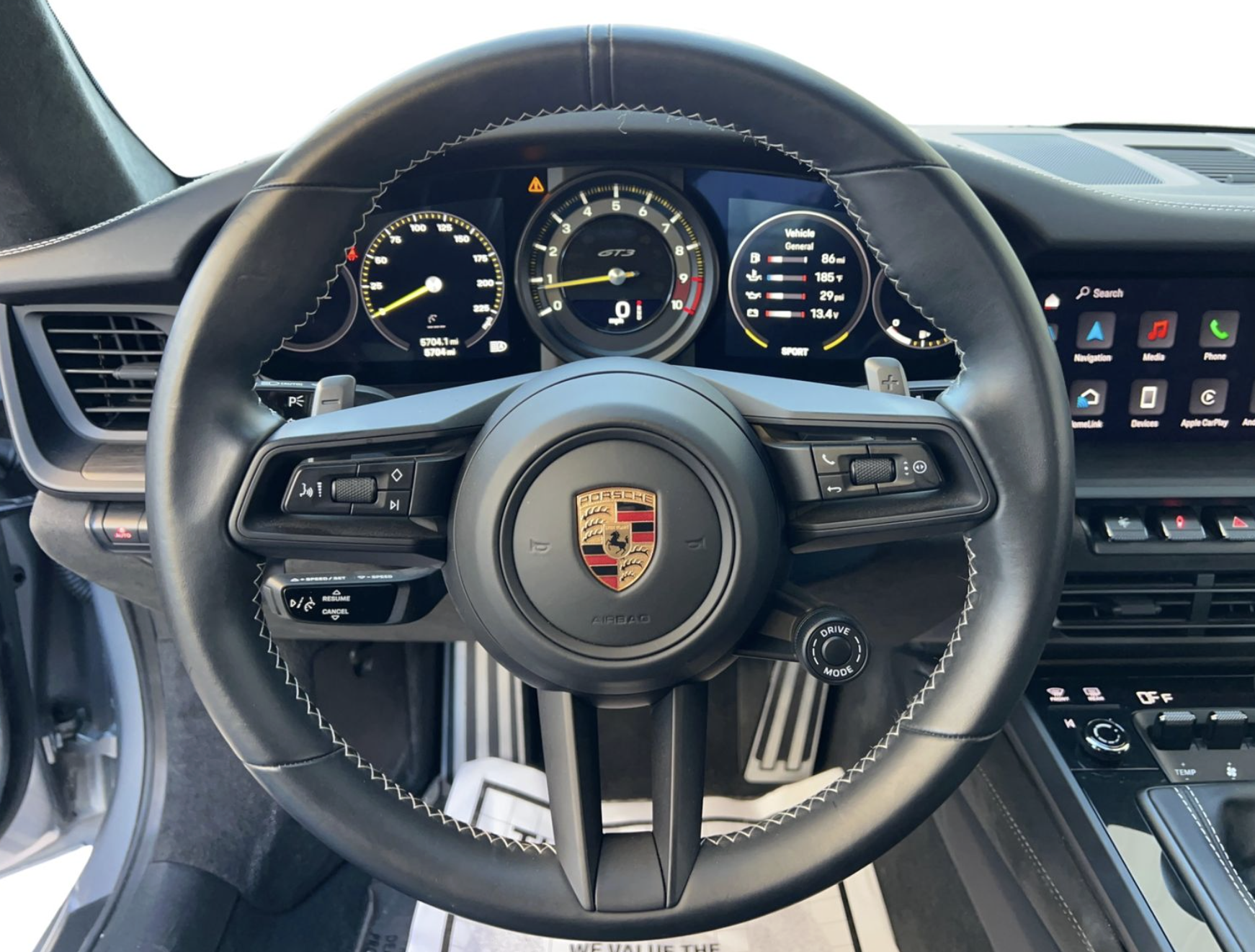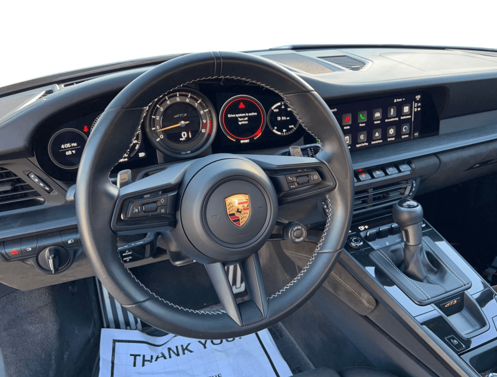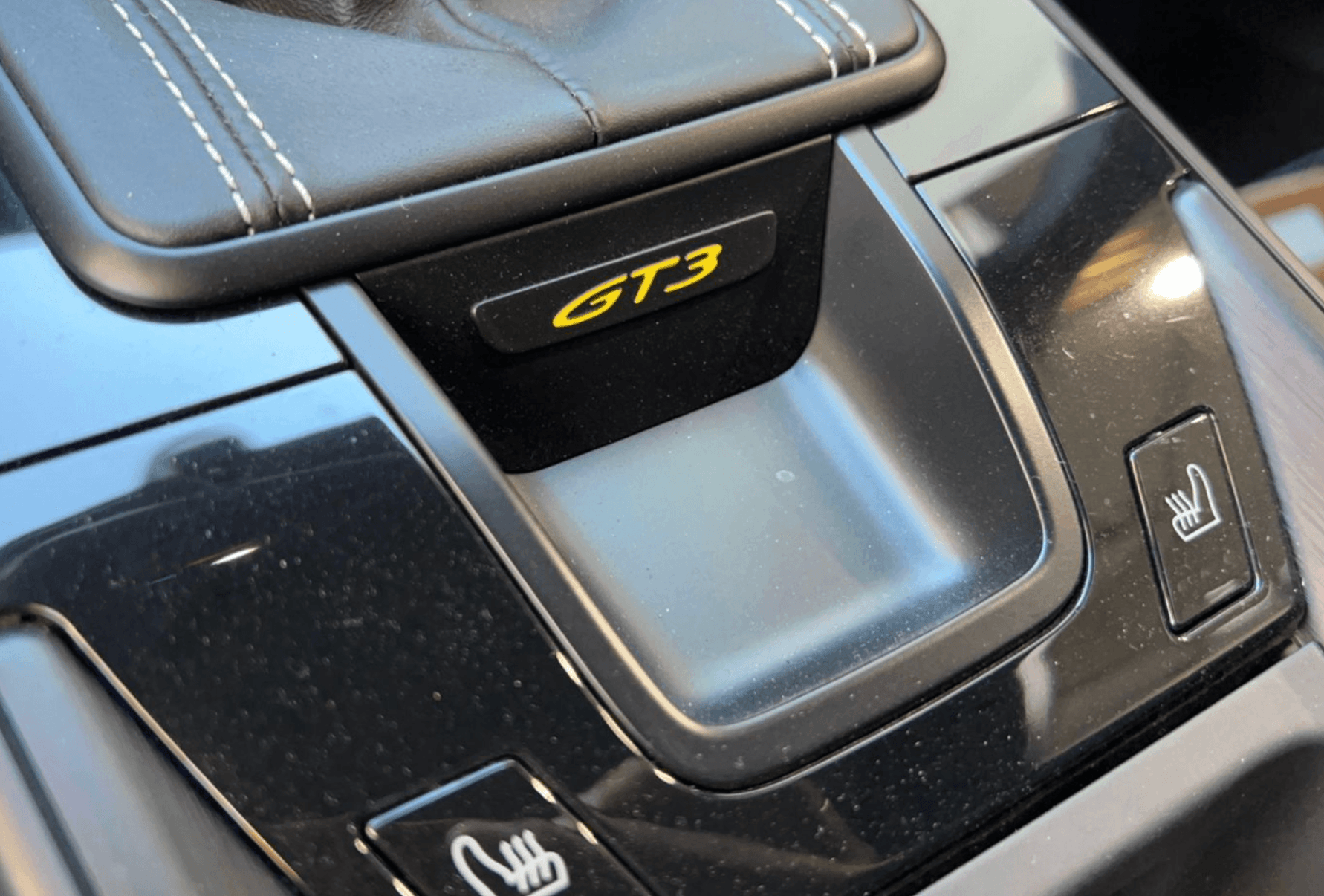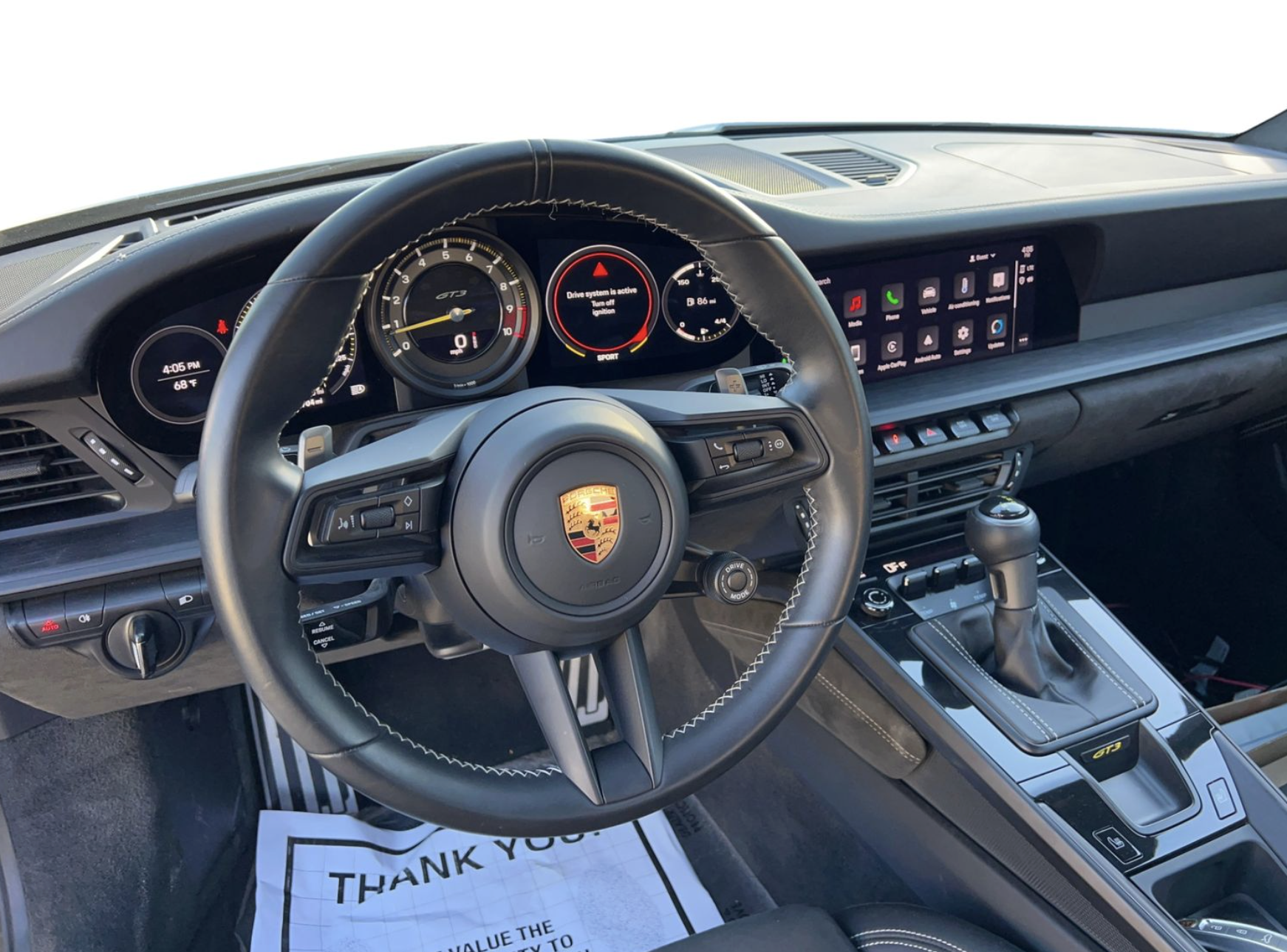 The interior is trimmed in Black leather with GT3-specific appointments throughout. The driver-focused cockpit emphasizes performance and control while retaining Porsche’s high level of fit and finish, making it equally suitable for spirited road driving and track use.