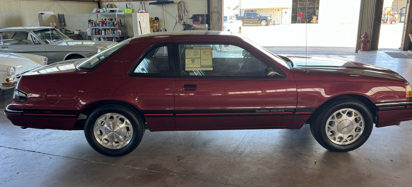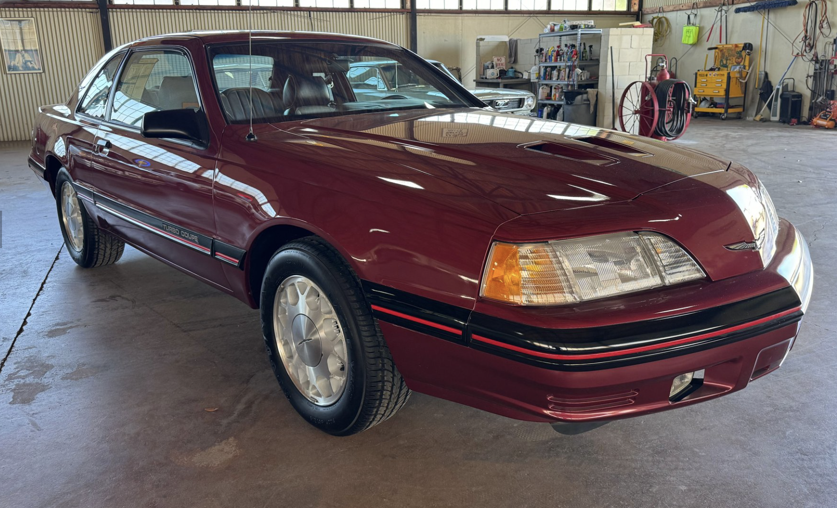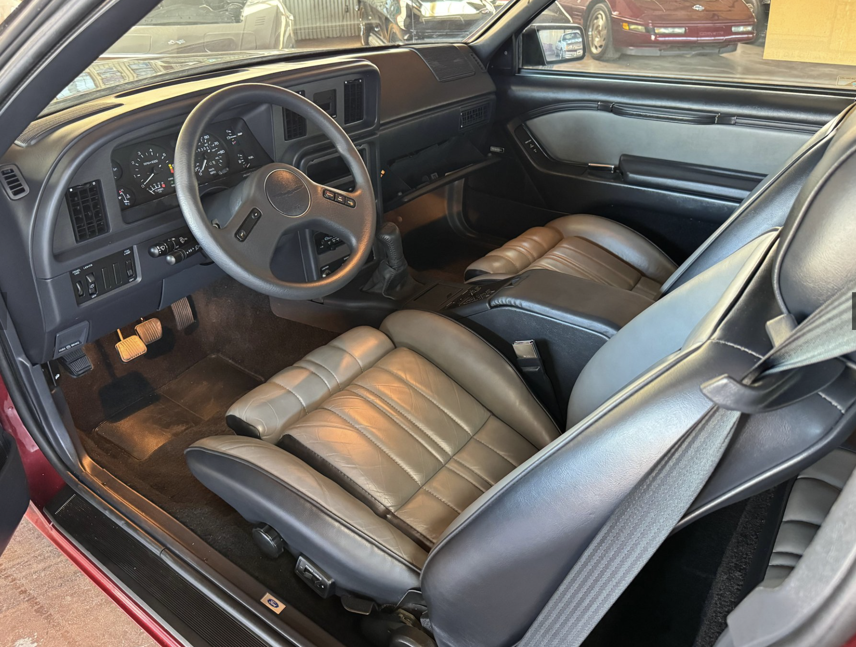 Power comes from the factory 2.3L turbocharged and intercooled inline-4 engine, producing 190 horsepower and 240 lb-ft of torque when paired with the sought-after Borg-Warner T-5 five-speed manual transmission. This drivetrain delivers strong mid-range performance, responsive boost, and a distinctly engaging driving experience. The Turbo Coupe’s suspension and chassis tuning provide confident handling and stability, making it one of the most advanced American performance coupes of its era.