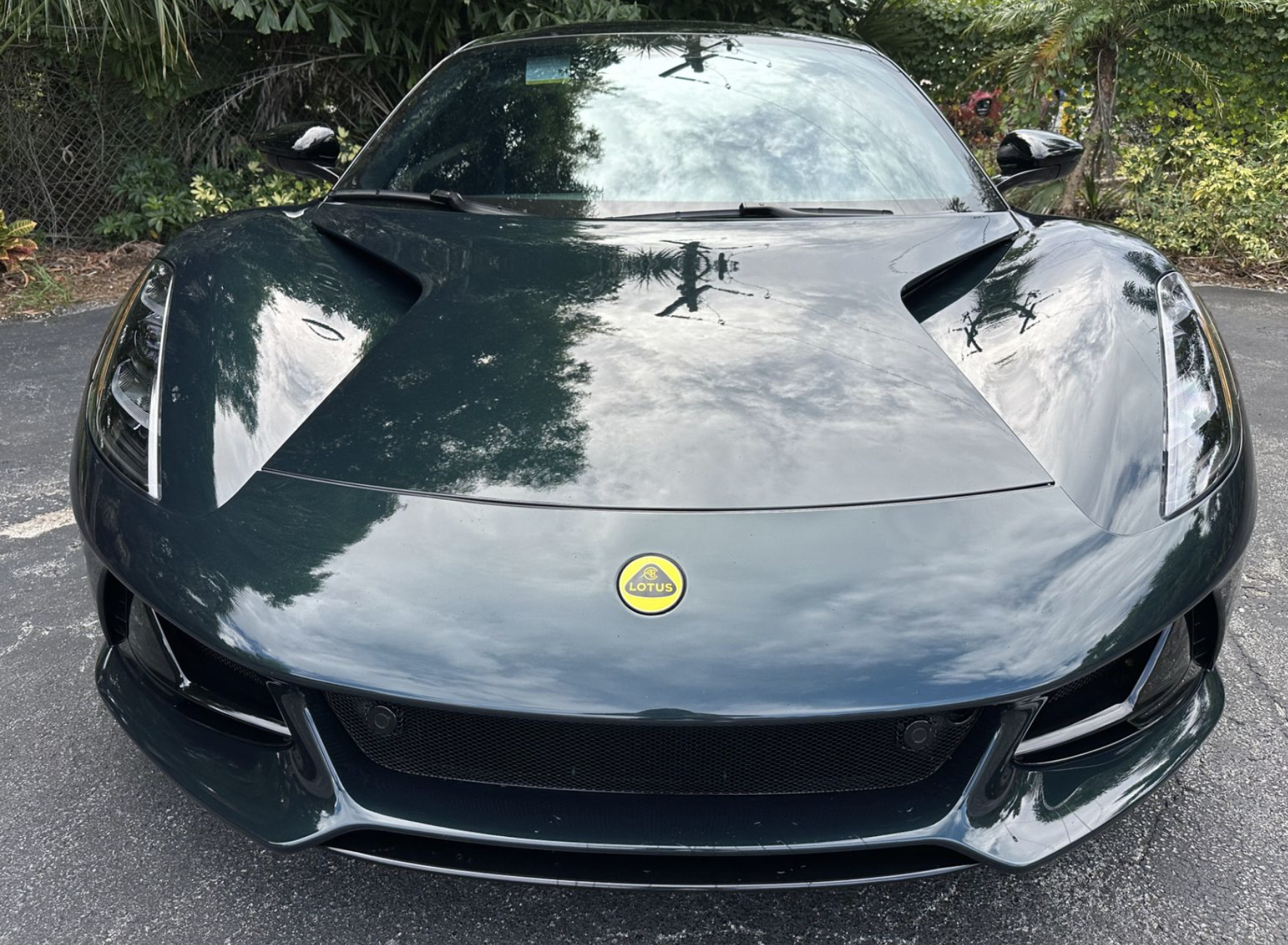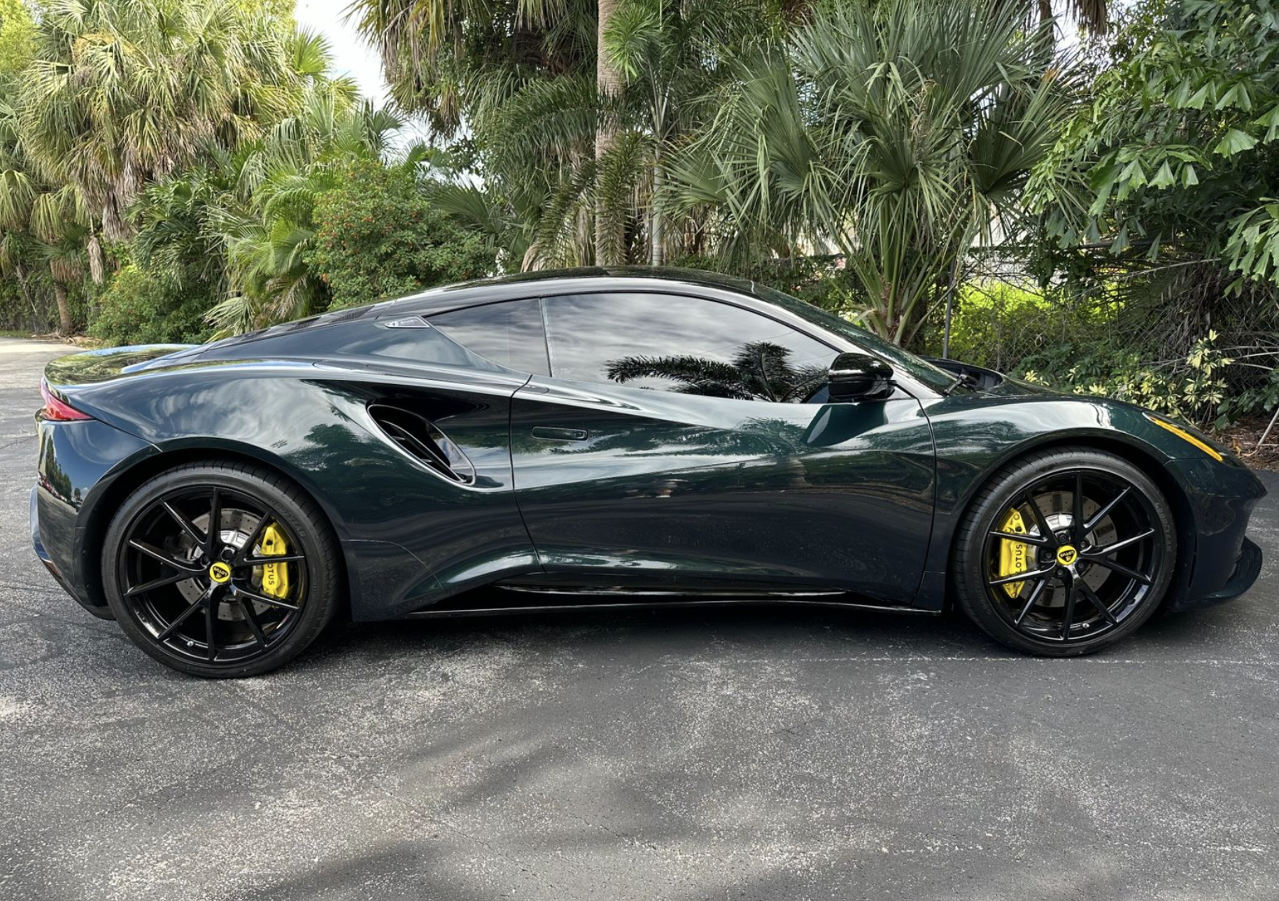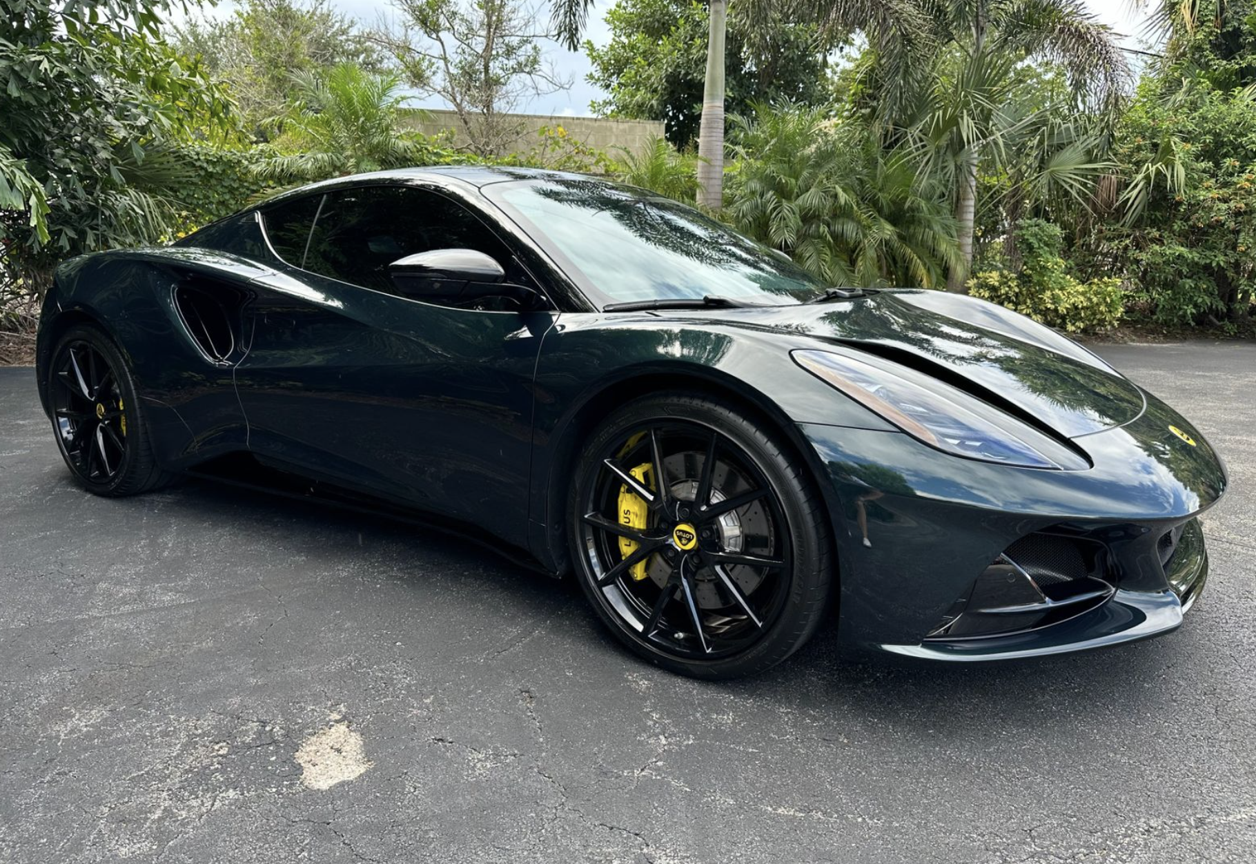 BK Auto Auctions presents this 2024 Lotus Emira V6 First Edition, finished in a striking Dark Verdant exterior over a premium black leather interior. This Emira is powered by a mid-mounted 3.5 L supercharged V6 engine producing 400 hp/ 310 lb-ft of torque, paired with a 6-speed manual transmission and rear-wheel drive. With only 3,000 miles showing and a clean title, this Emira is offered in excellent condition and ready for an enthusiast seeking a modern, high-performance British sports car. With a clean title and meticulous presentation, this Emira stands as a pristine example of the highly sought-after First Edition, offering an exceptional blend of modern engineering and pure sports-car engagement.