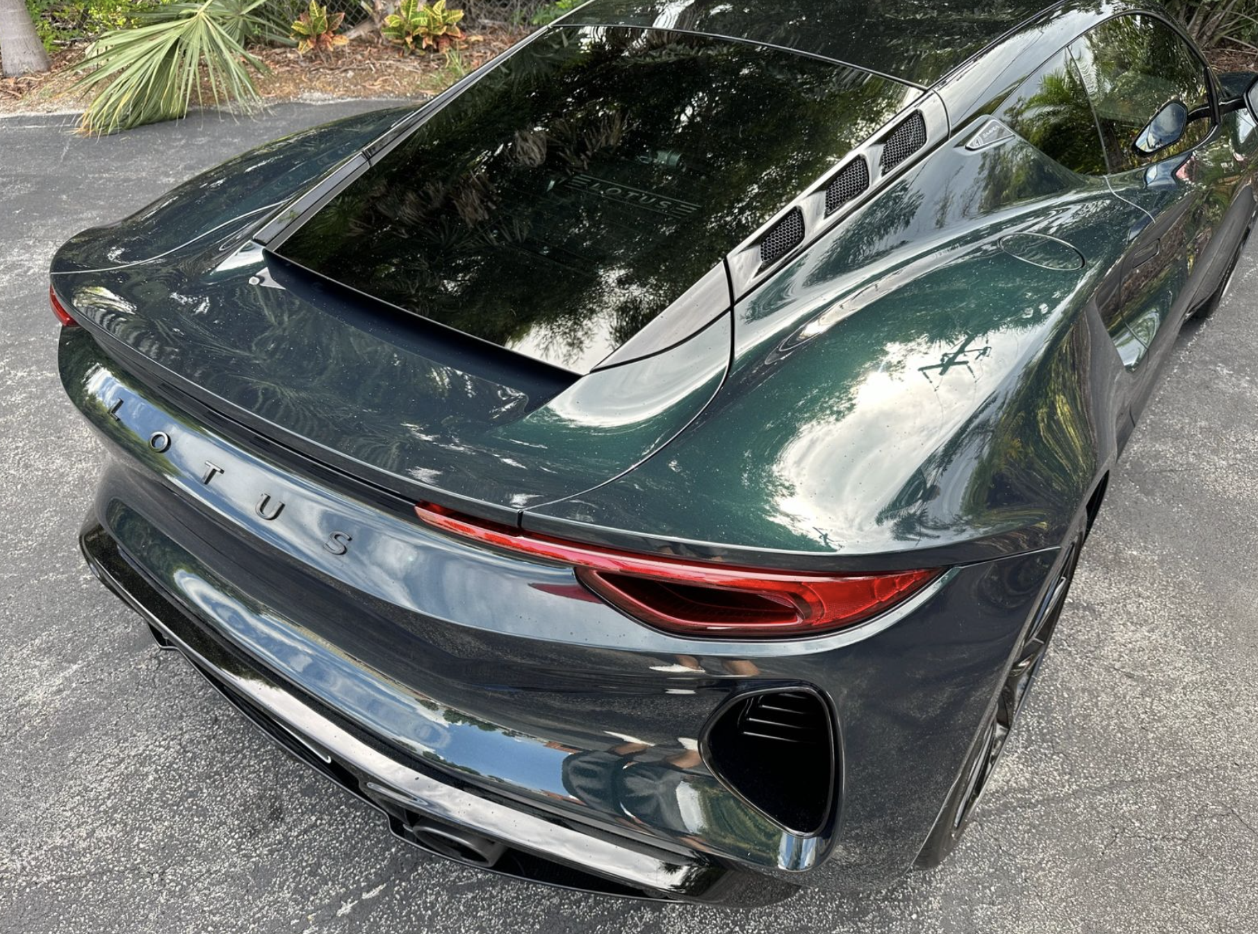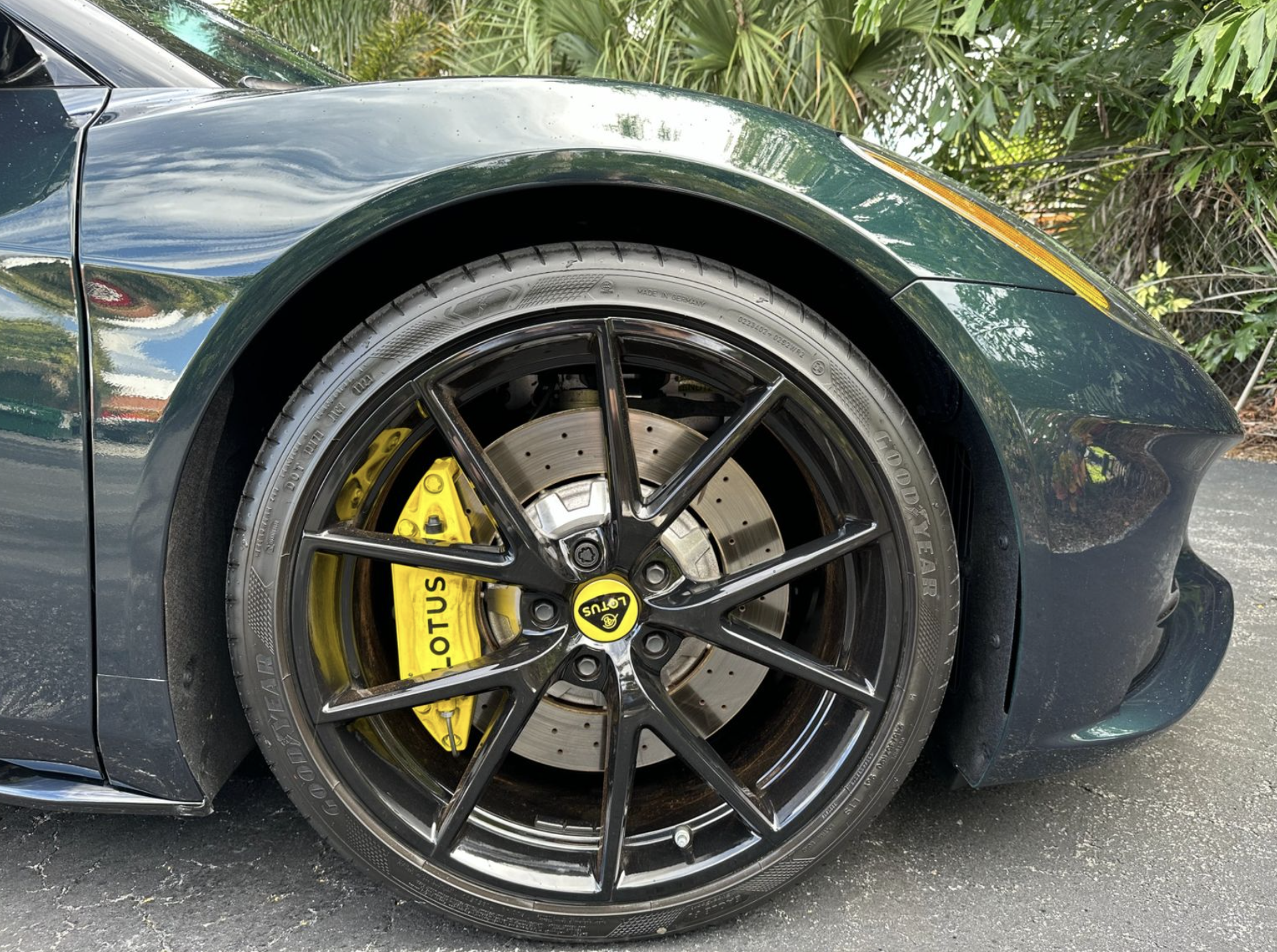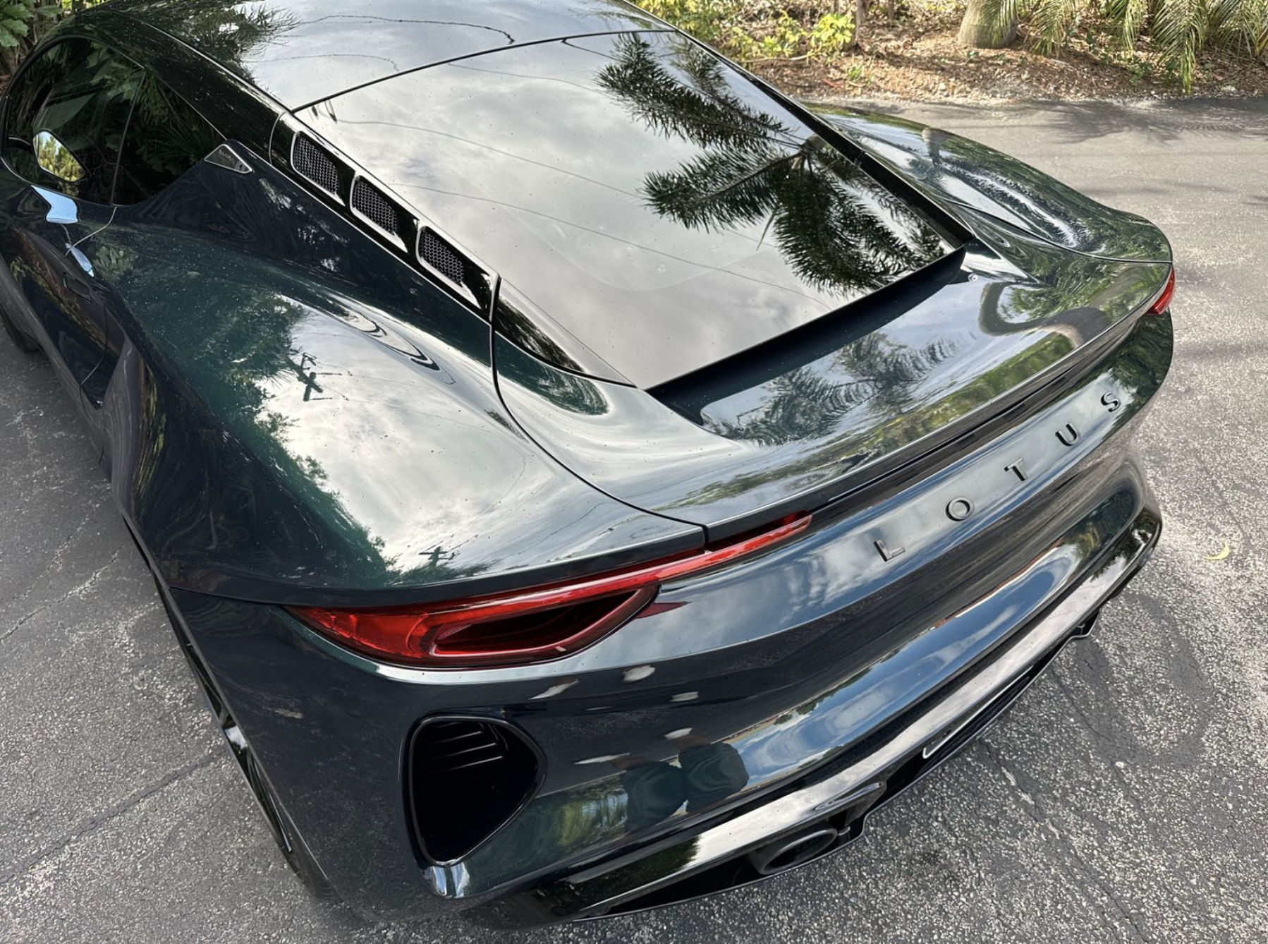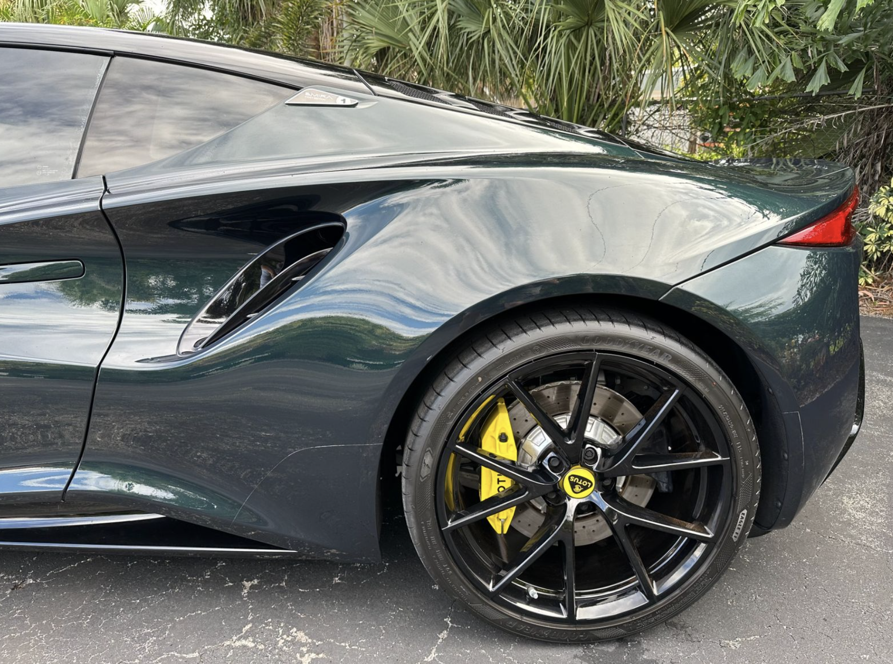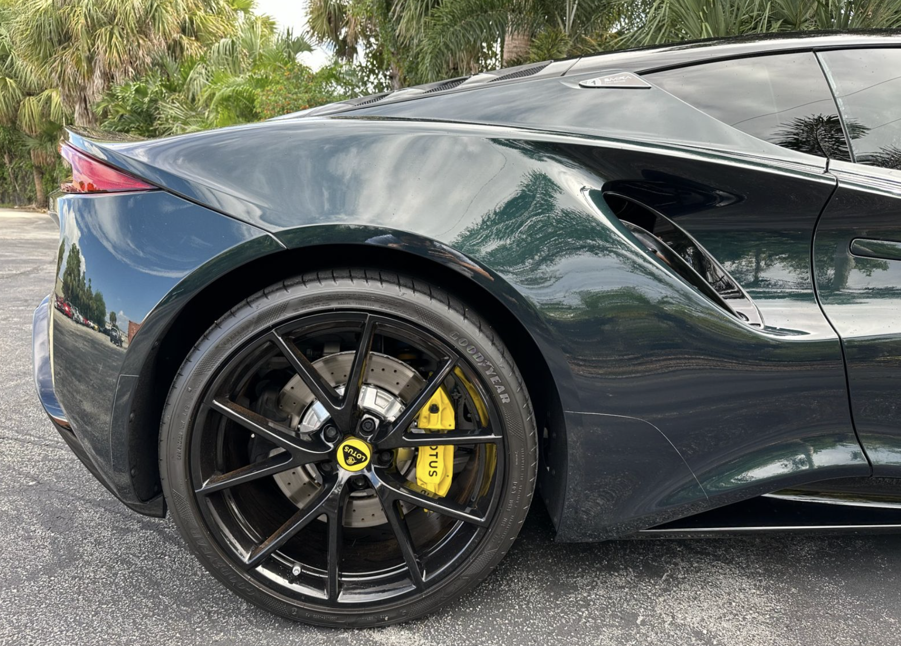 This Emira V6 First Edition exhibits the sleek, aerodynamic styling Lotus is known for — with sculpted bodywork, LED lighting all around, gloss-black lower-body trim from the standard Lower Black Pack, a rear lip spoiler, and lightweight 20-inch forged alloy wheels. The Dark Verdant paint stands out with deep color and presence, complemented by dual exhaust outlets and a purposeful stance that reflects the car’s mid-engine sports-car pedigree.