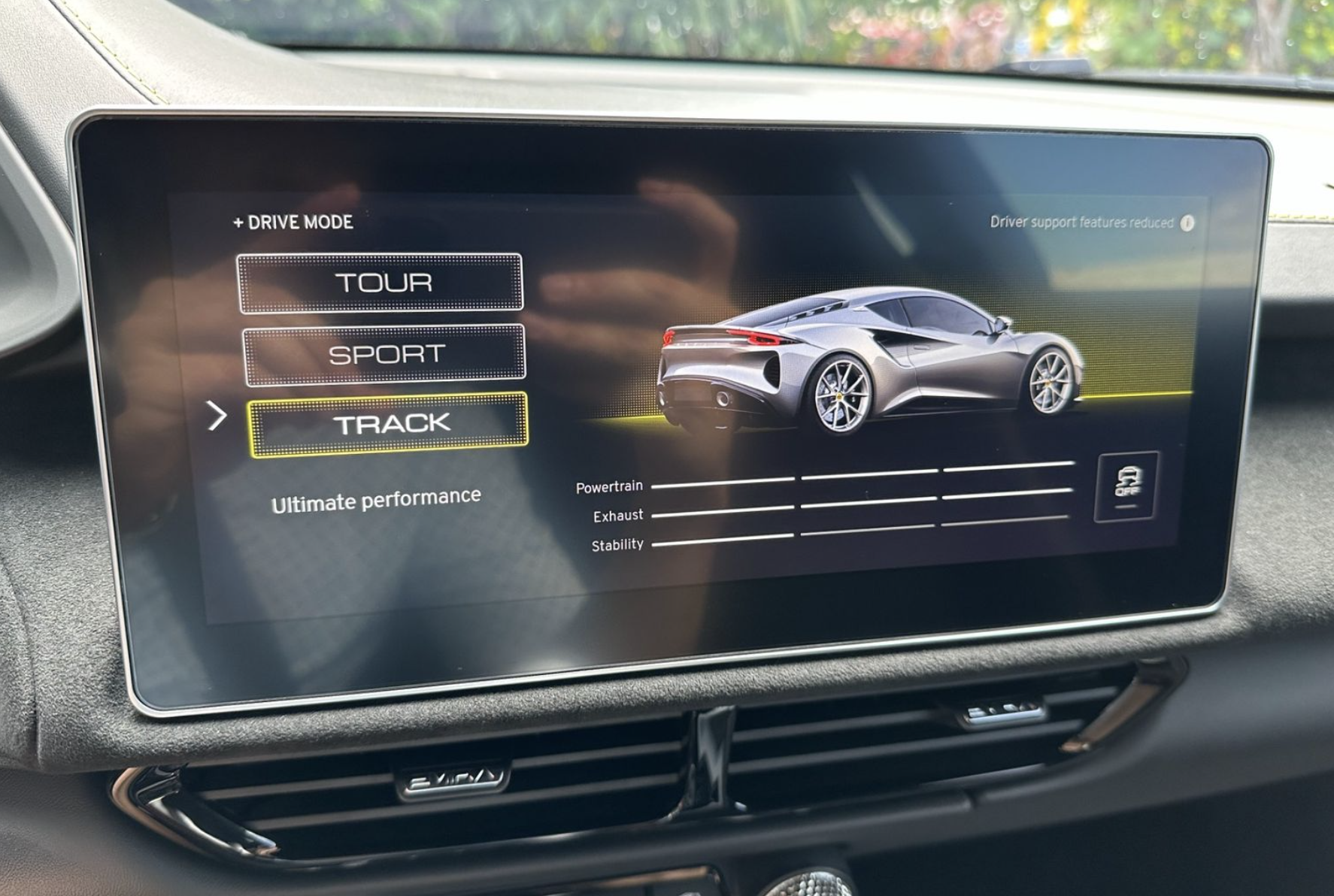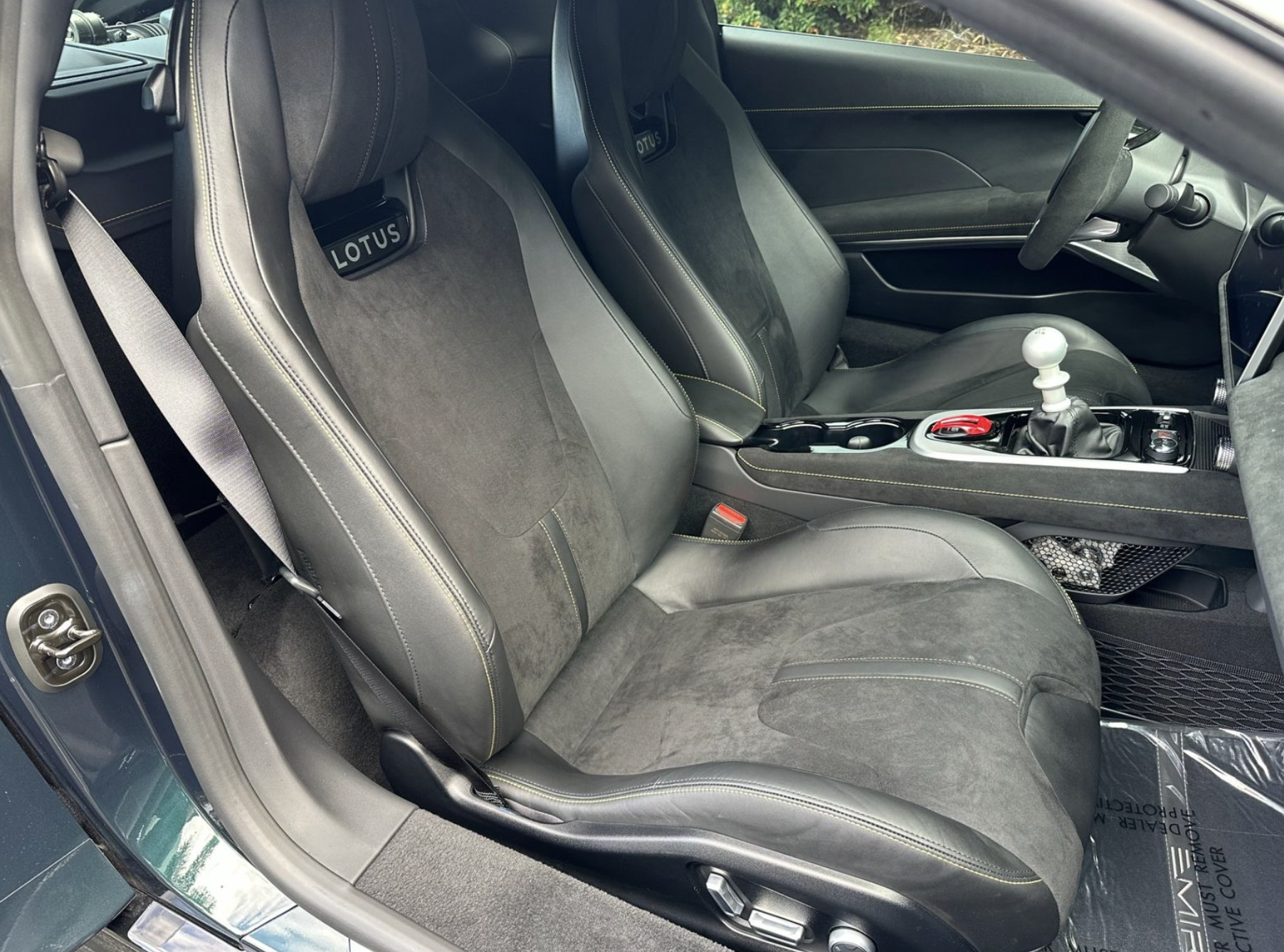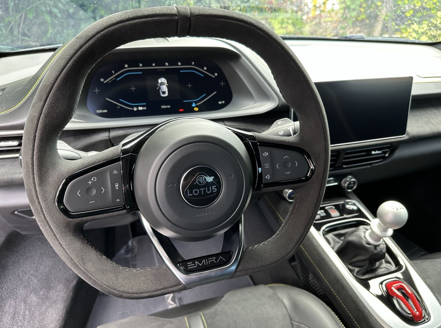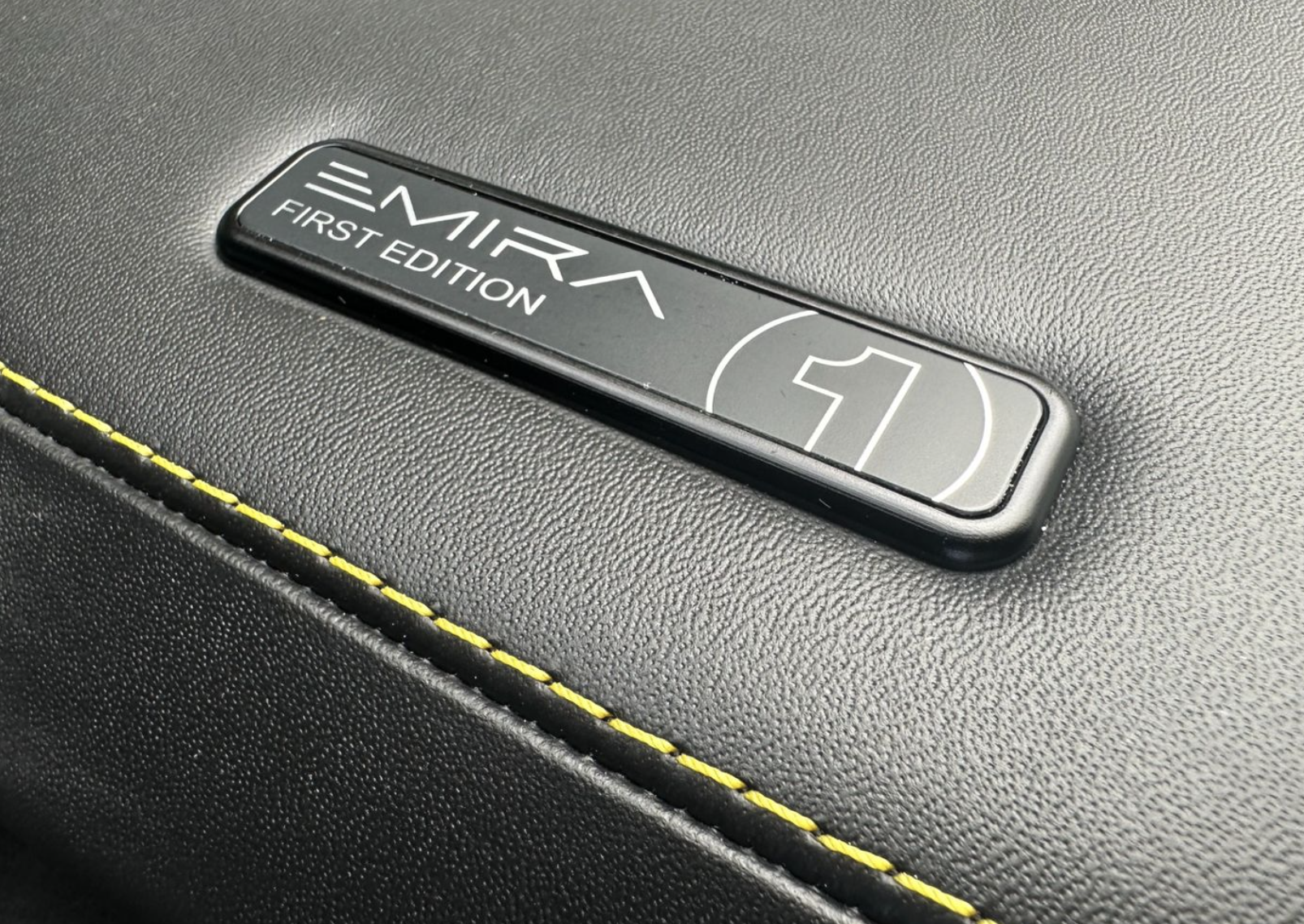 Inside, the cabin is trimmed in premium black leather with sporty bucket-style front seats, a leather-wrapped steering wheel, and high-quality aluminum and leather trim elements. Convenience and comfort features include dual-zone climate control, a 12.3-inch digital instrument cluster with customizable display, a 10.25-inch infotainment touchscreen with modern connectivity (Bluetooth, navigation), power-adjustable seats, and push-button start — giving this Emira the blend of driver-focused engagement and everyday usability a modern driver expects.